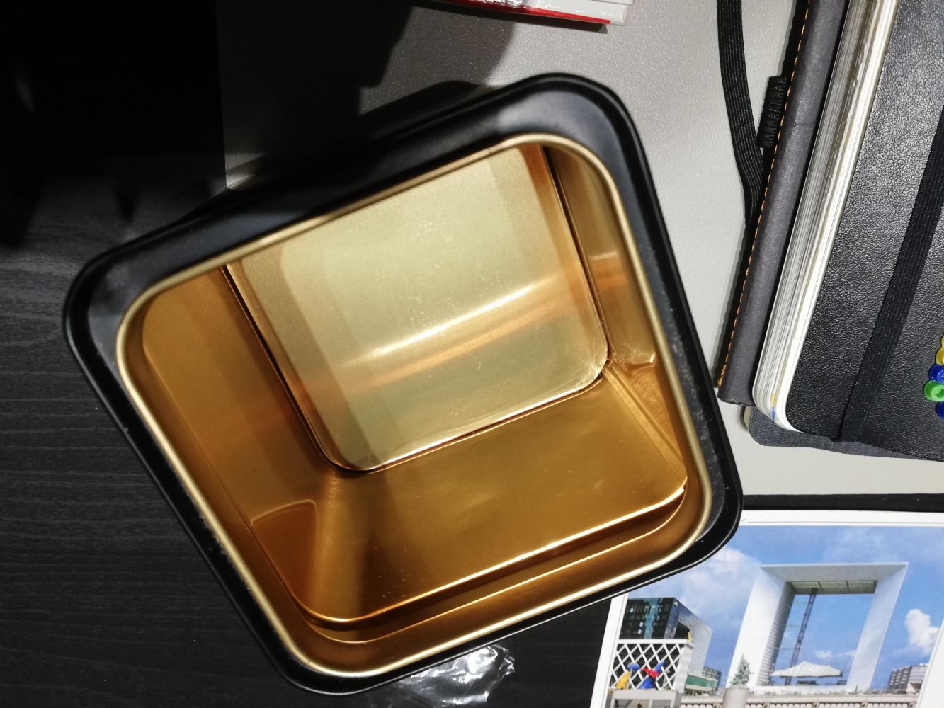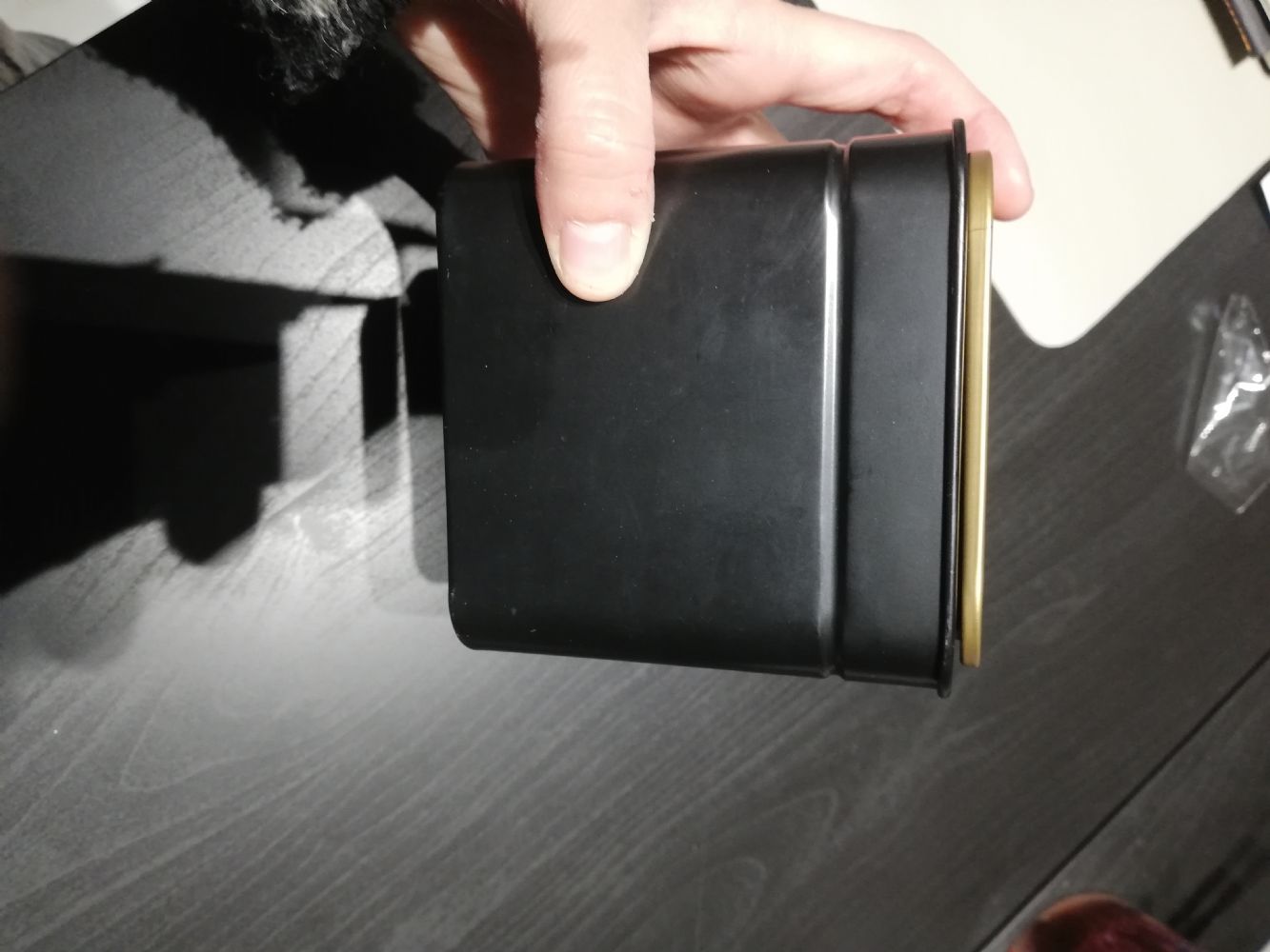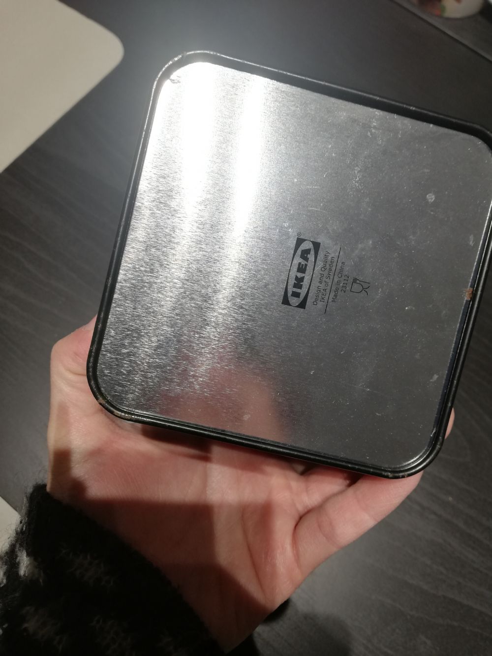 Contenitore con coperchio in latta Ikea. Leggera ammaccatura da un lato ma essendo nera non si vede.