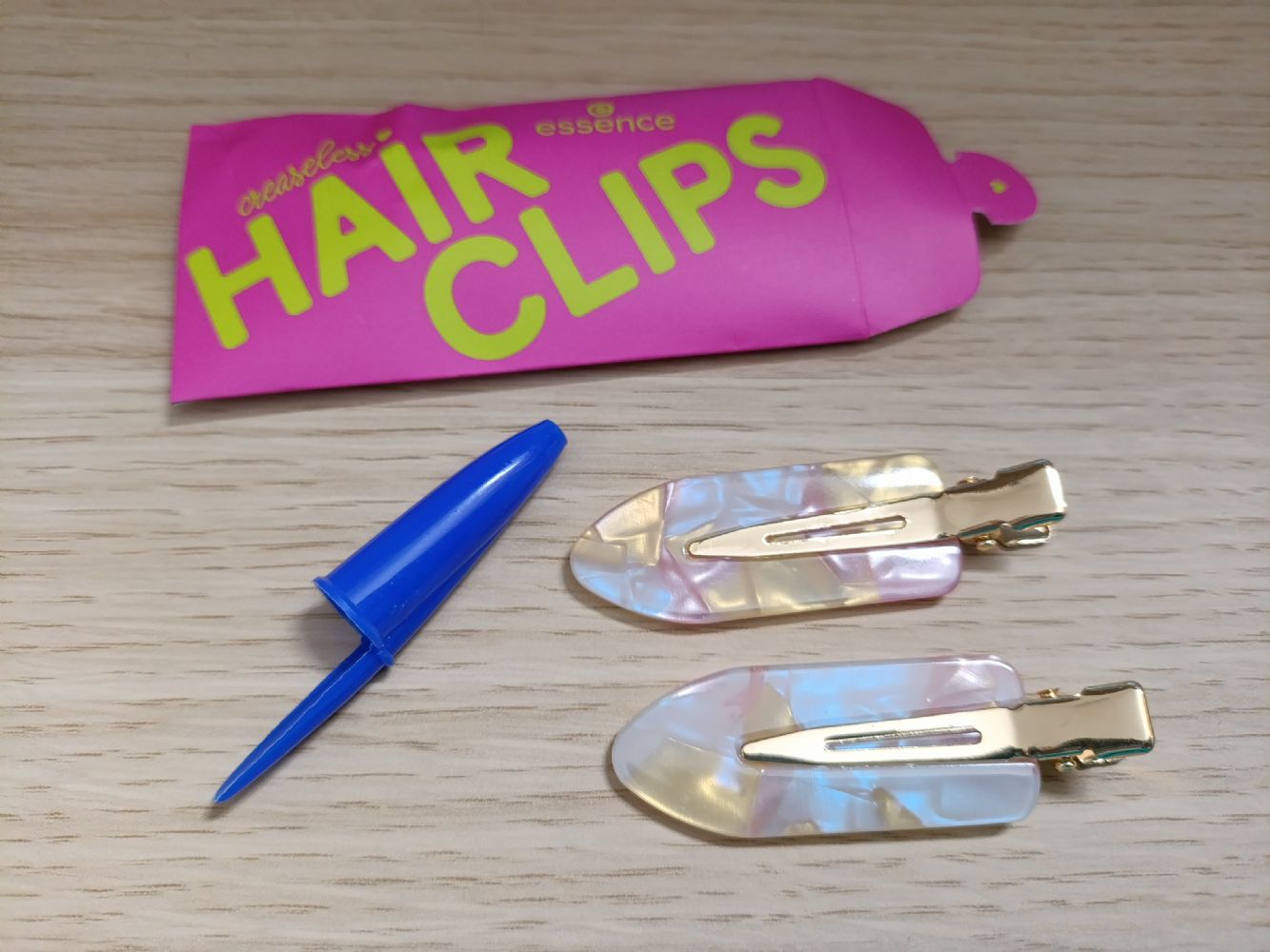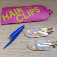 Descrizione:Due mollette per capelli, dorate con decorazione in plastica cangiante tipo madreperla. Marca Essence, nuove e regalabili