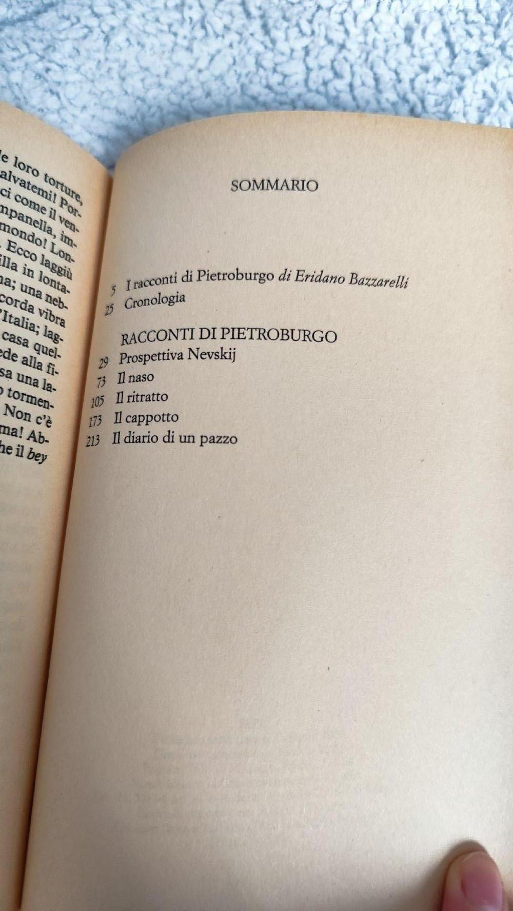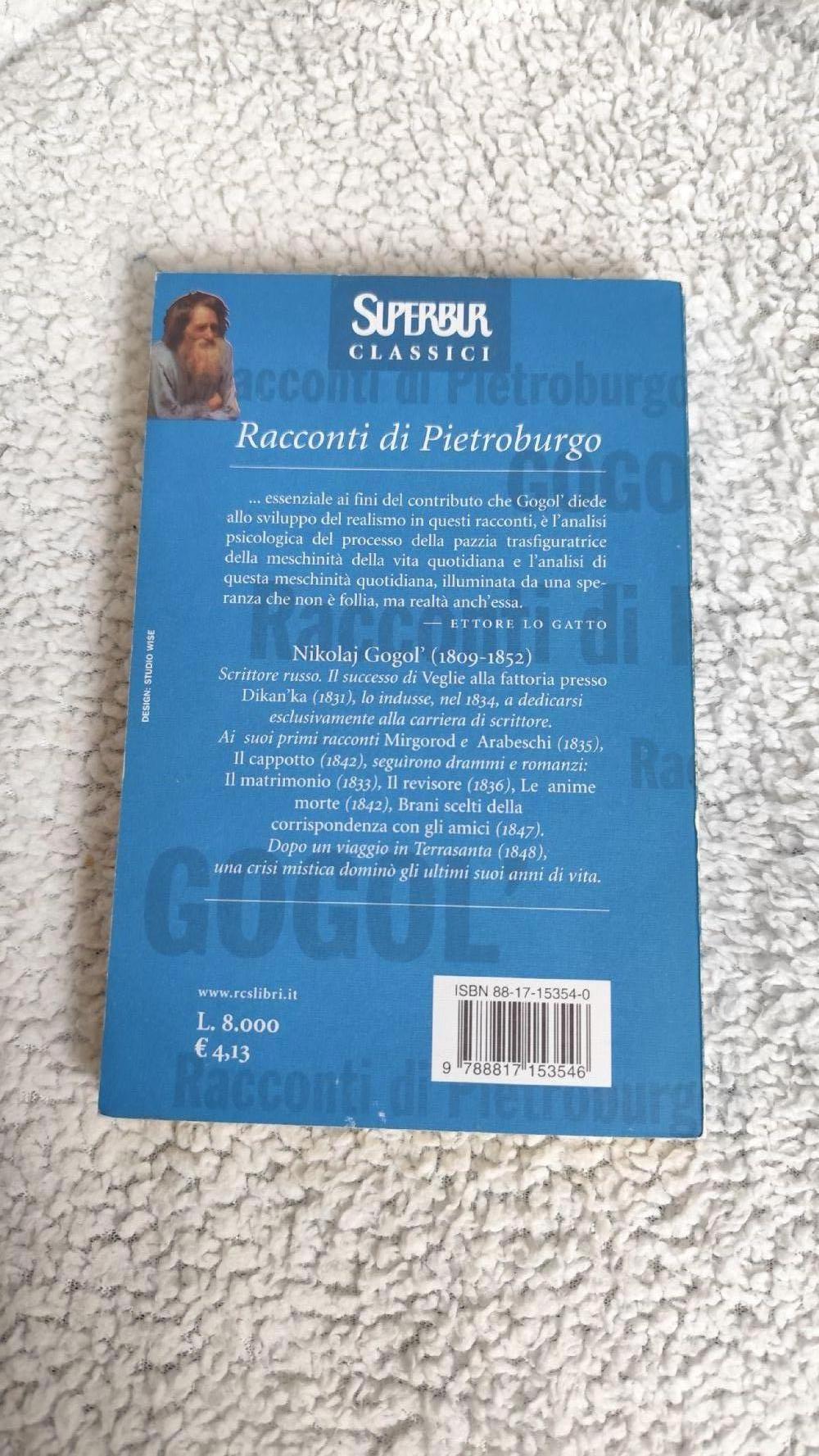 “Siamo tutti usciti da 'Il cappotto' di Gogol'” Fëdor Dostoevskij Pietroburgo non è una città: è un progetto, un sogno, un miraggio, un'allucinazione, o un incubo, se volete, ma non è una città. E non c'è un autore che meglio di Gogol' abbia visto e reso tangibile la sua realtà. I suoi "Racconti di Pietroburgo" ci restituiscono l'essenza di questa città, che è la cultura che vi è germinata. Leggendo questi cinque smilzi racconti sarete in un attimo gogolianamente proiettati nel mondo di Puskin, di Dostoevskij, di Andrej Belyj, di Anna Achmatova e Andrej Bitov; grazie a queste cinque capriole gogoliane vi troverete in un istante imbevuti di cultura pietroburghese. E dunque: non mettete piede a Pietroburgo senza prima aver letto i racconti di Gogol'… non vedreste nulla, non capireste nulla… Restituiti al lettore italiano nella traduzione di Damiano Rebecchini, questi racconti iniziano oggi una nuova vita, vestiti di tutto punto, con un nuovo cappotto tagliato a meraviglia, pronti a popolare i sogni pietroburghesi dei loro futuri lettori.