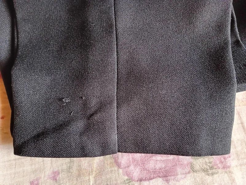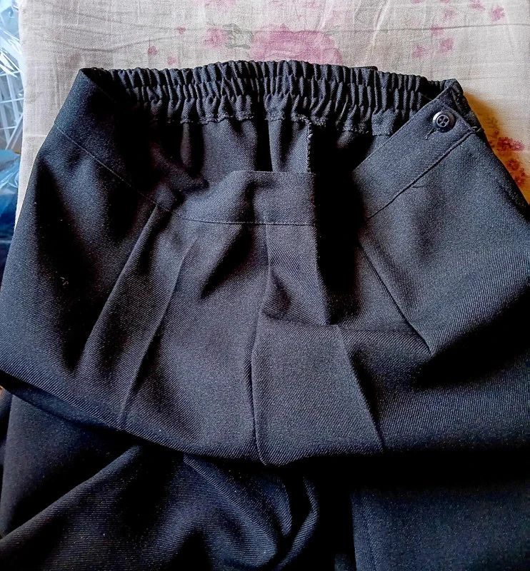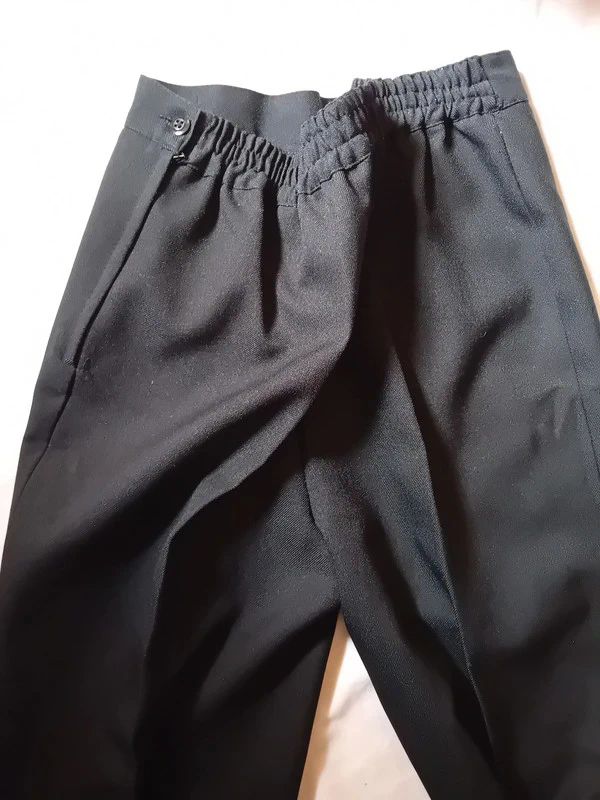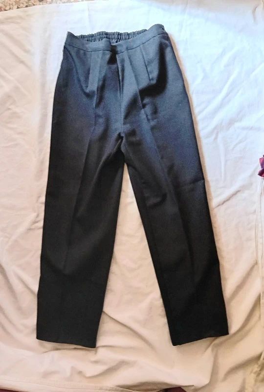 Descrizione:Presi qui ma piccoli per me. Pantaloni classici con la piega, con vita elastica. Sembrano nuovi, se non per 2 o 3 punti in cui escono dei fili dell'orlo, vedi ultime 2 foto (è un'inezia, ma ci tengo alla correttezza). Puro poliestere. Taglia L, vita a riposo 35 cm.