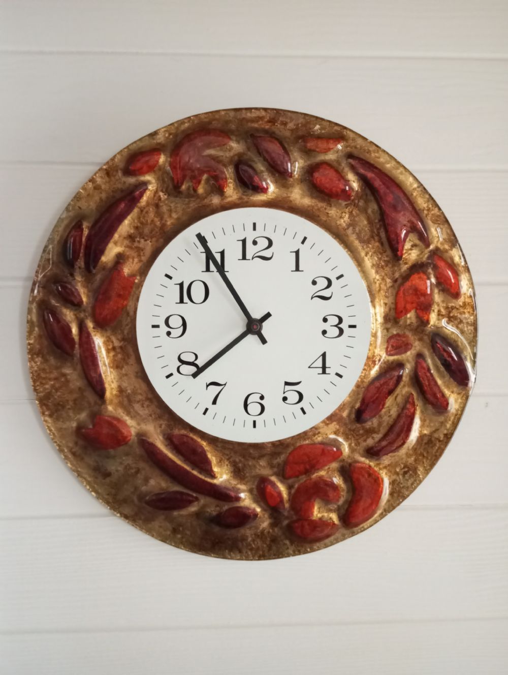 Descrizione:Vetro spesso dipinto in oro e rosso, diametro 35 cm.