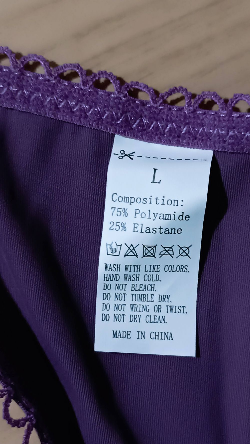 Perizoma Taglia L (abbondante) Colore Viola Materiale in foto ed aggiungo che il tassello interno è cotone.
