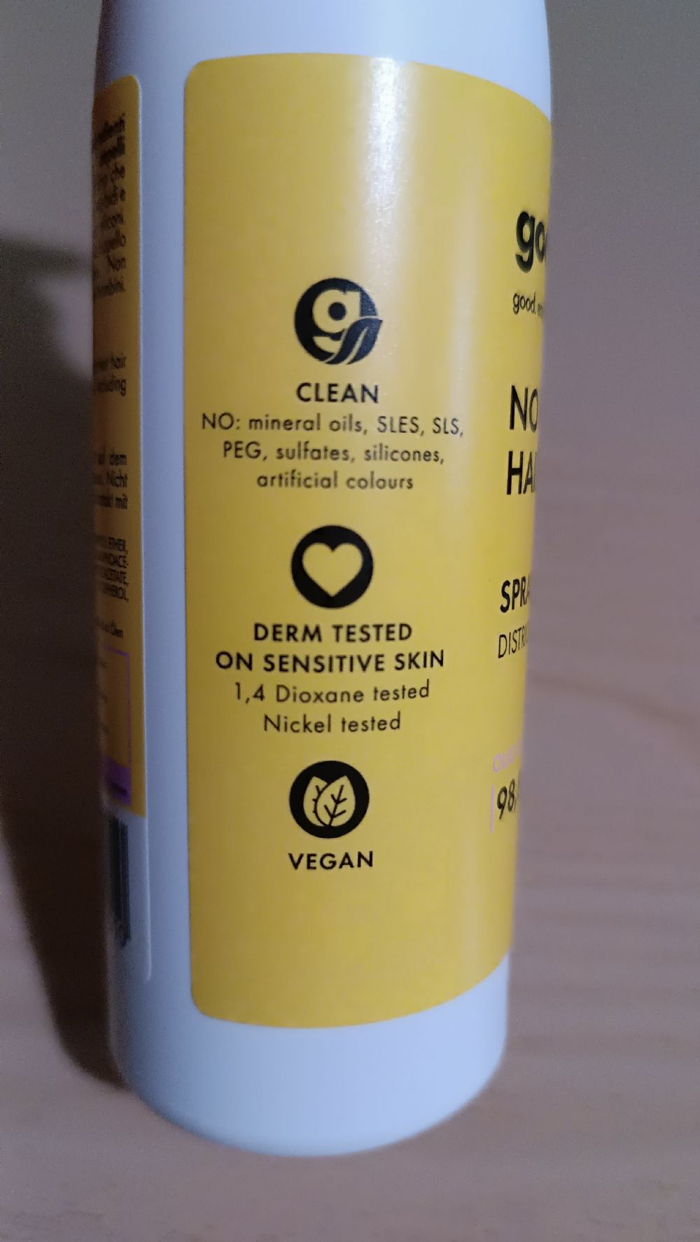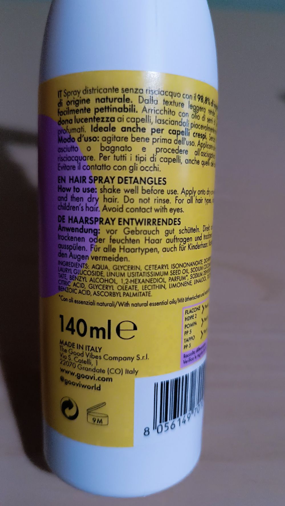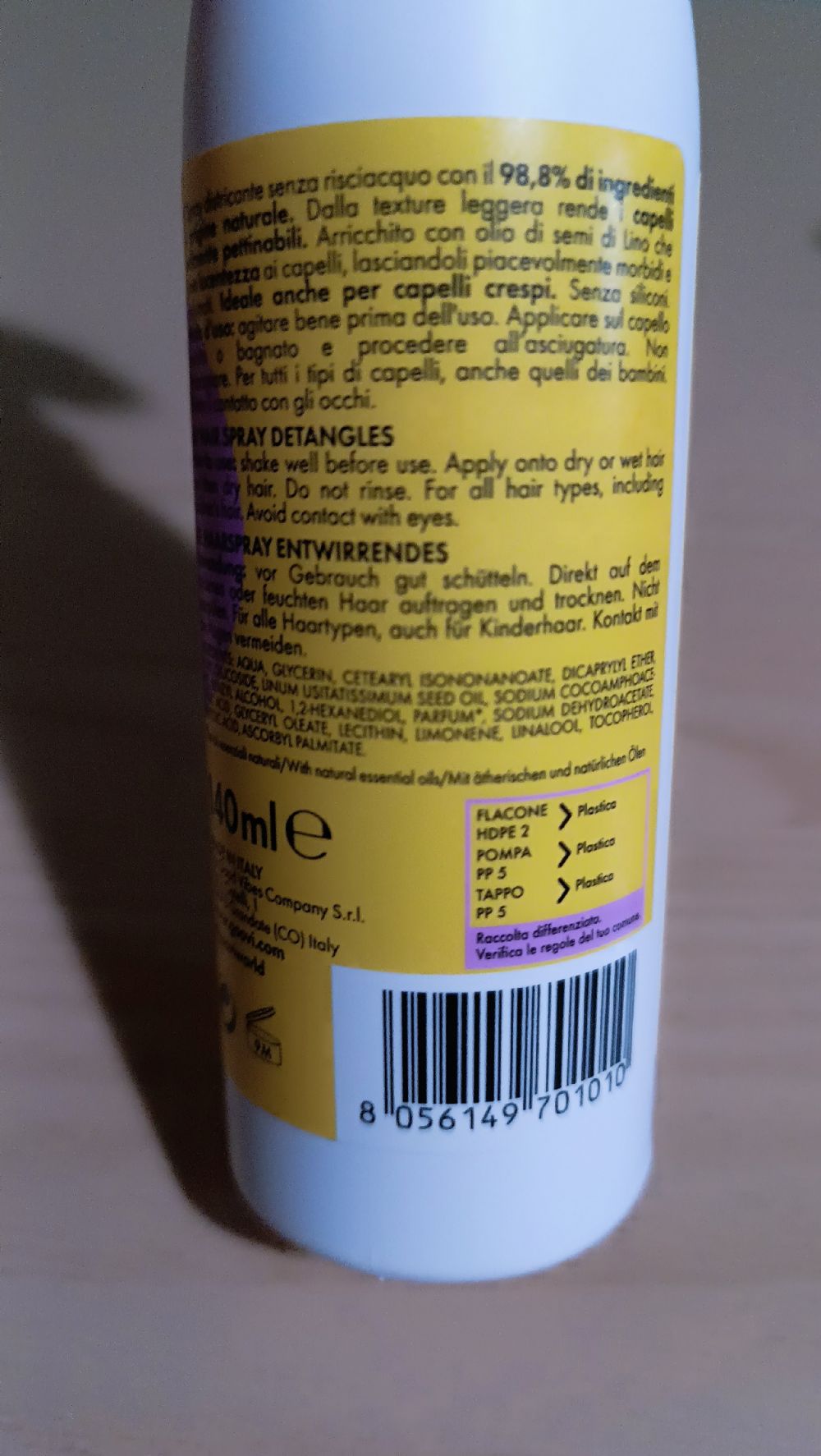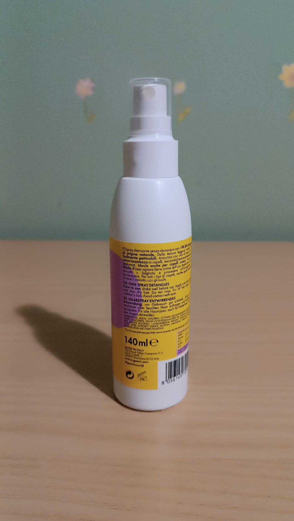 Spray districante con 98,8% da ingredienti di origine naturale, migliora la pettinabilità senza appesantire i capelli, dona lucentezza lasciandoli morbidi.