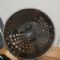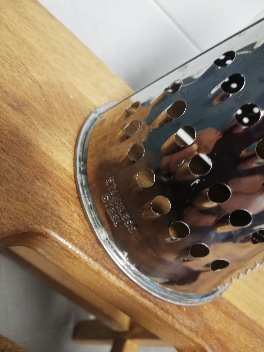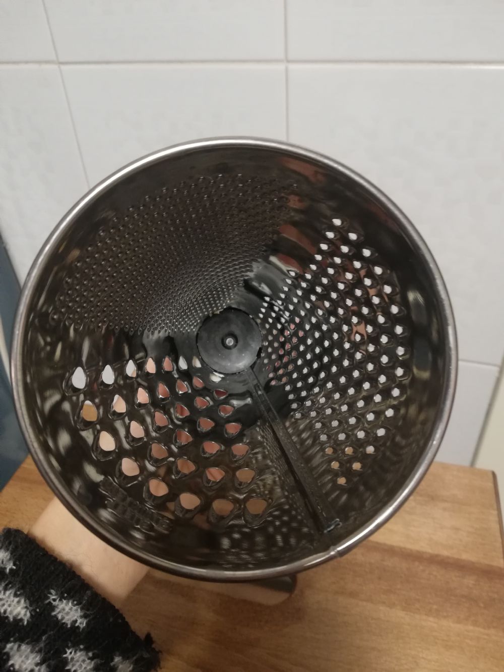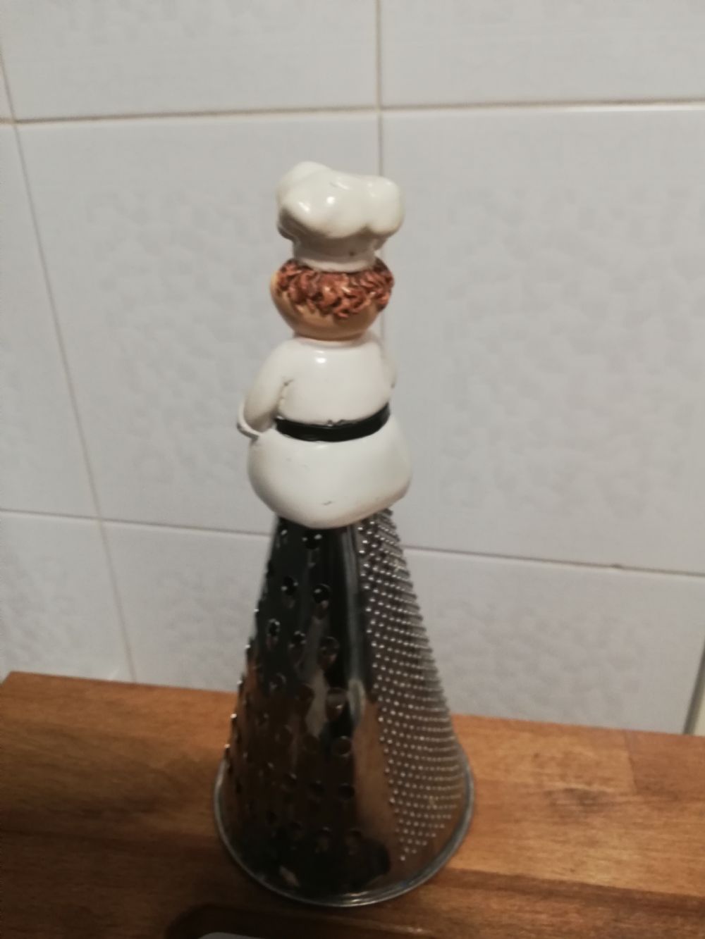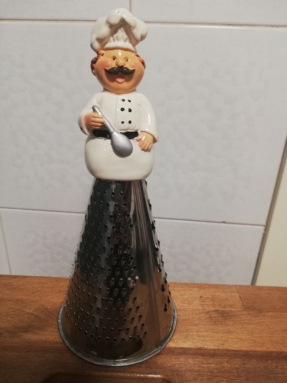 Grattugia con fori diversi, in acciaio. Sulla sommità un simpatico chef credo ceramica. Altezza 25 cm, diametro di base 11 cm.