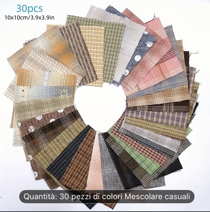 Sono 30 ritagli di stoffe nuovi di circa 10 x 10 cm.