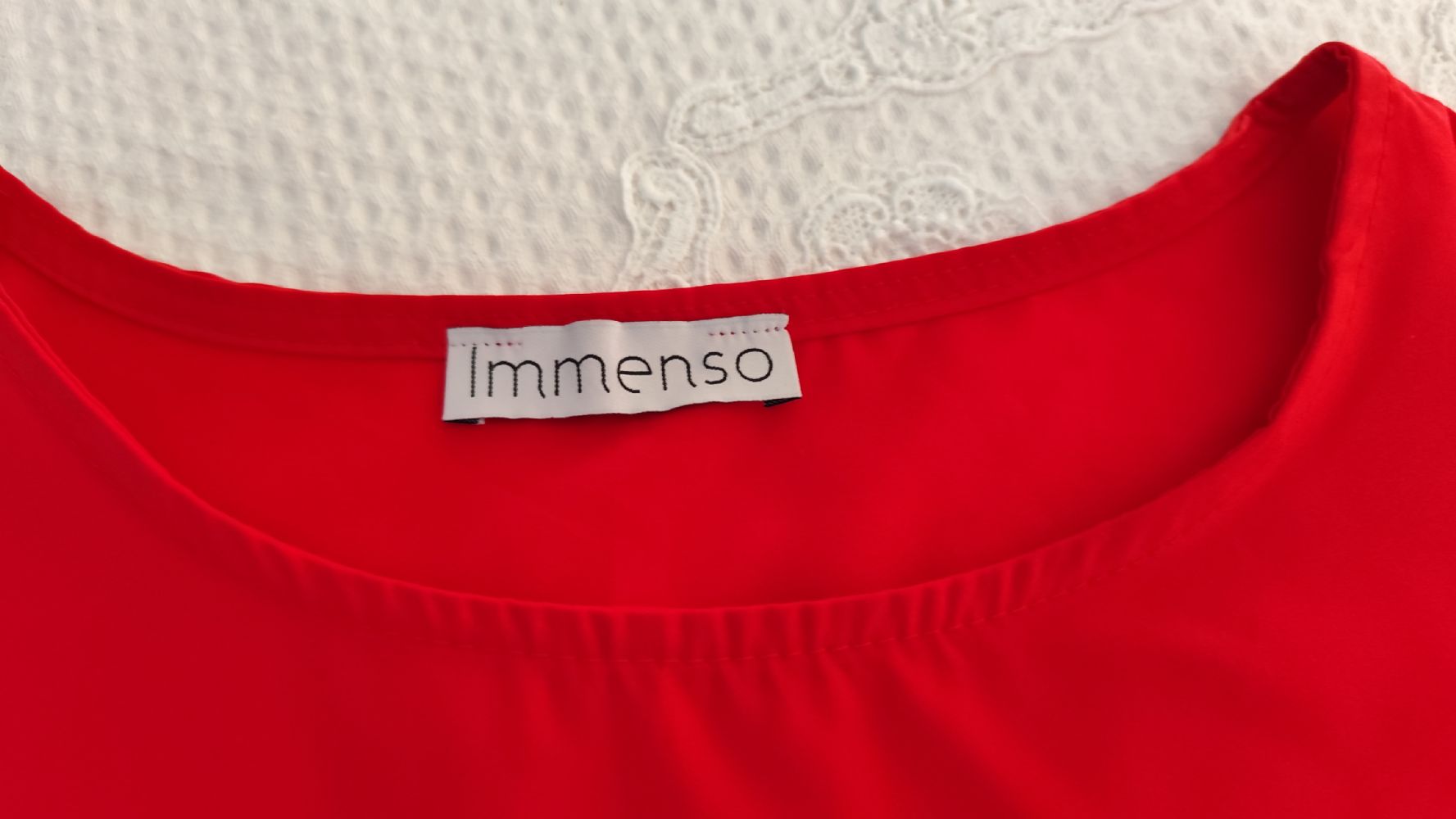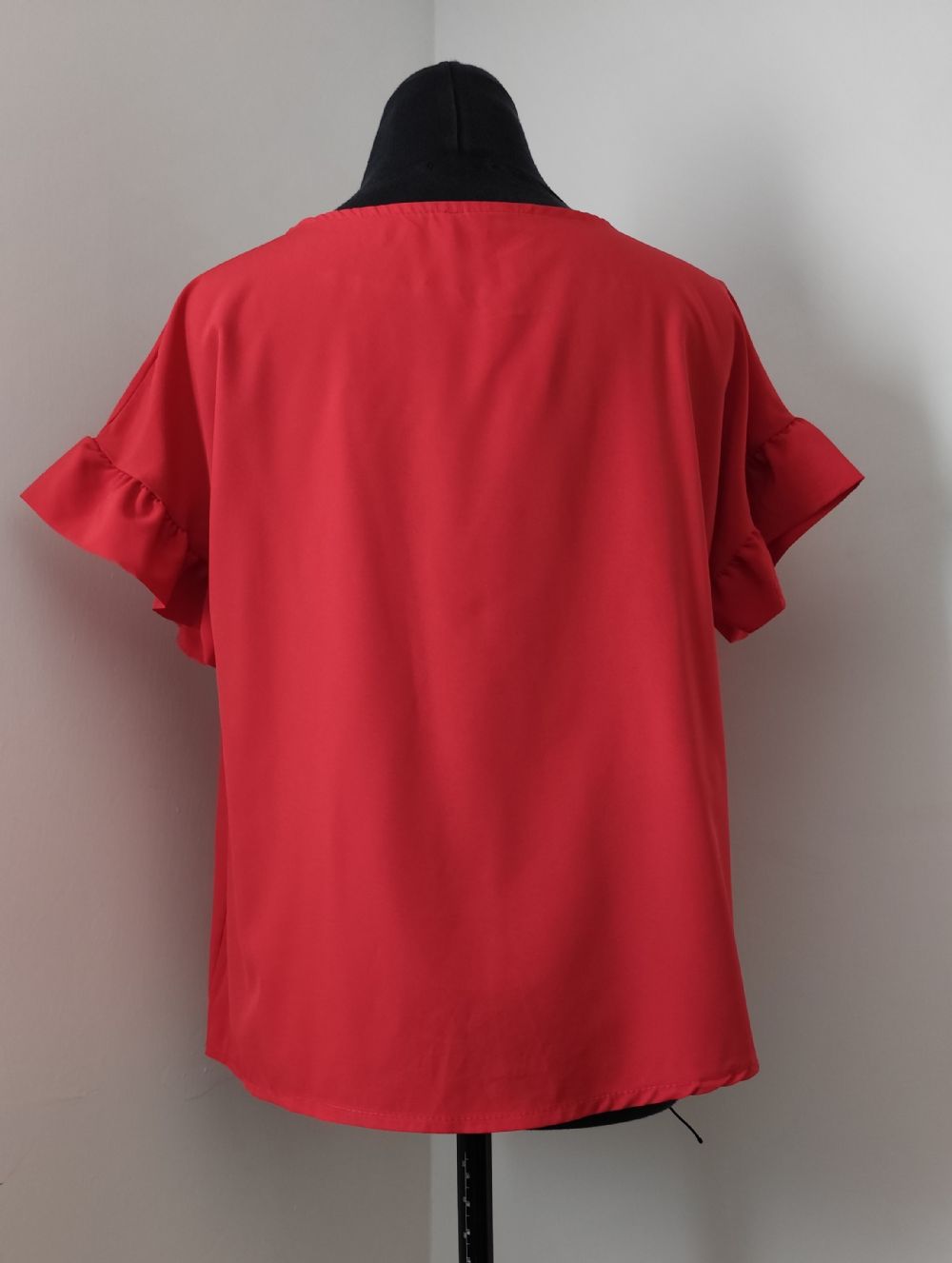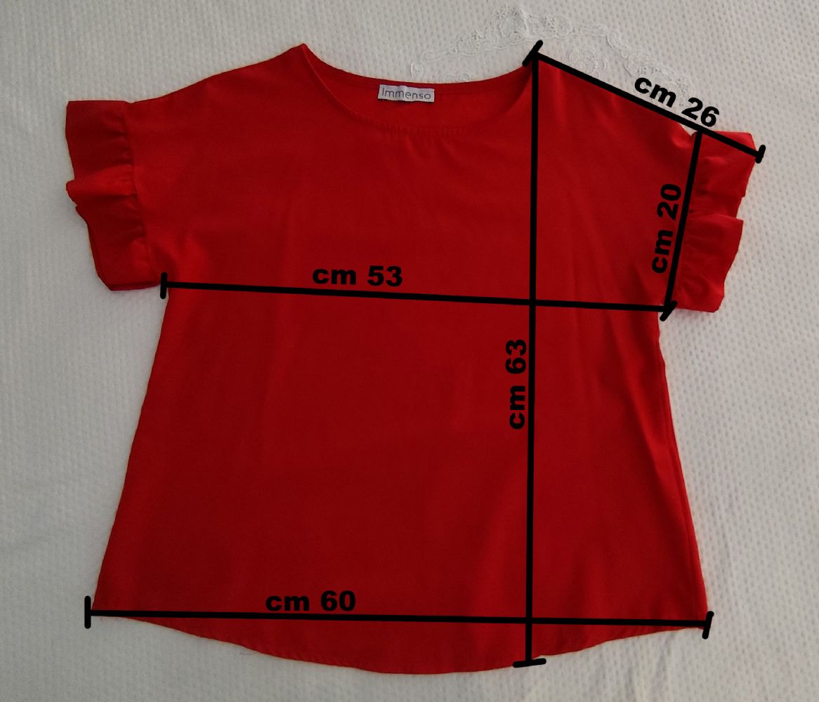 Descrizione:Blusa rossa Immenso, modello a kimono con volant alla manica, fondo arrotondato e scollatura rotonda. Il colore è più acceso dal vivo rispetto alle foto. Molto bella e basic, è in perfetto stato.
