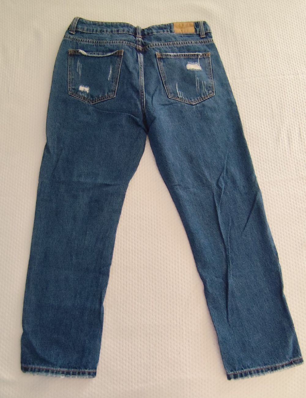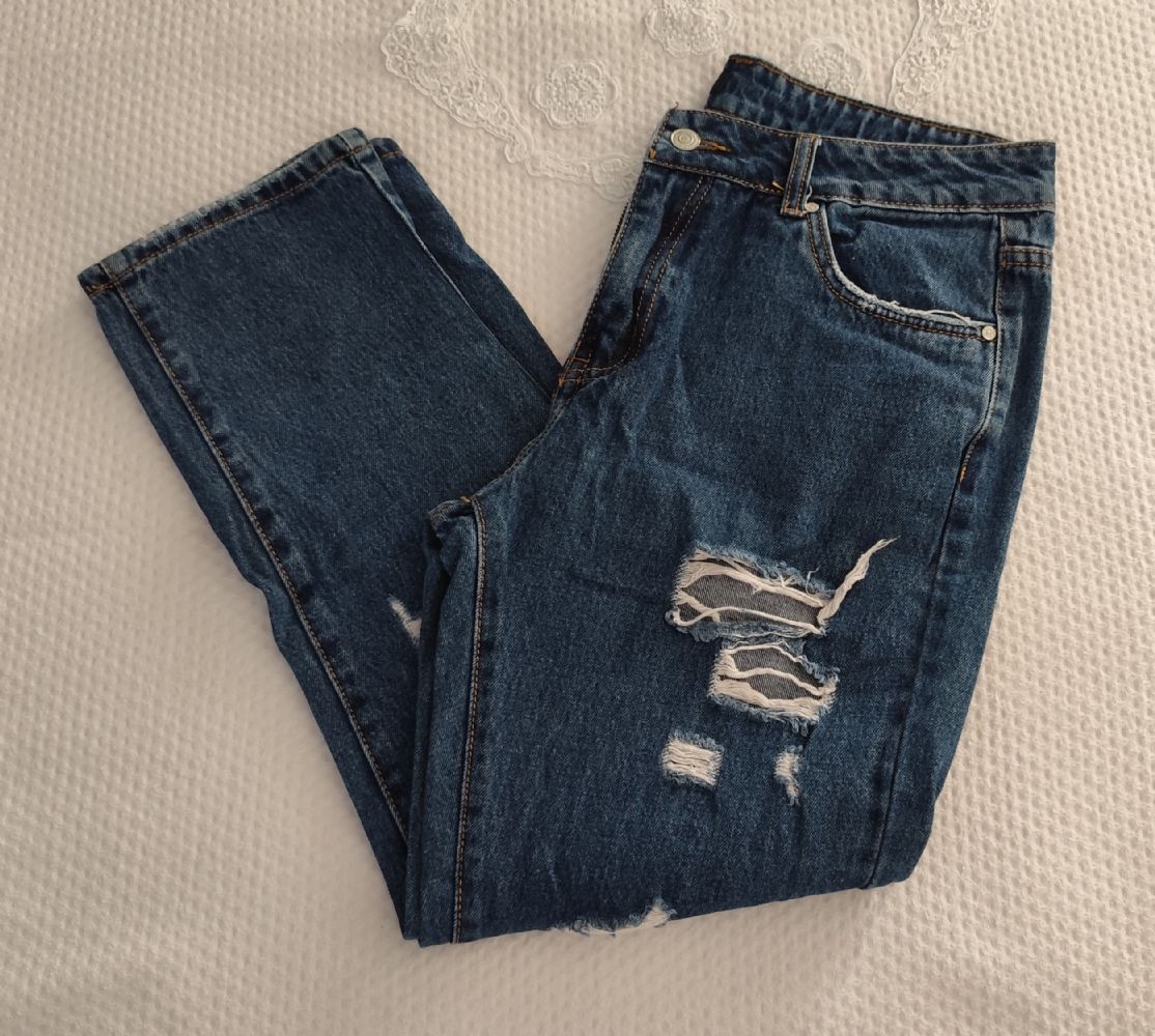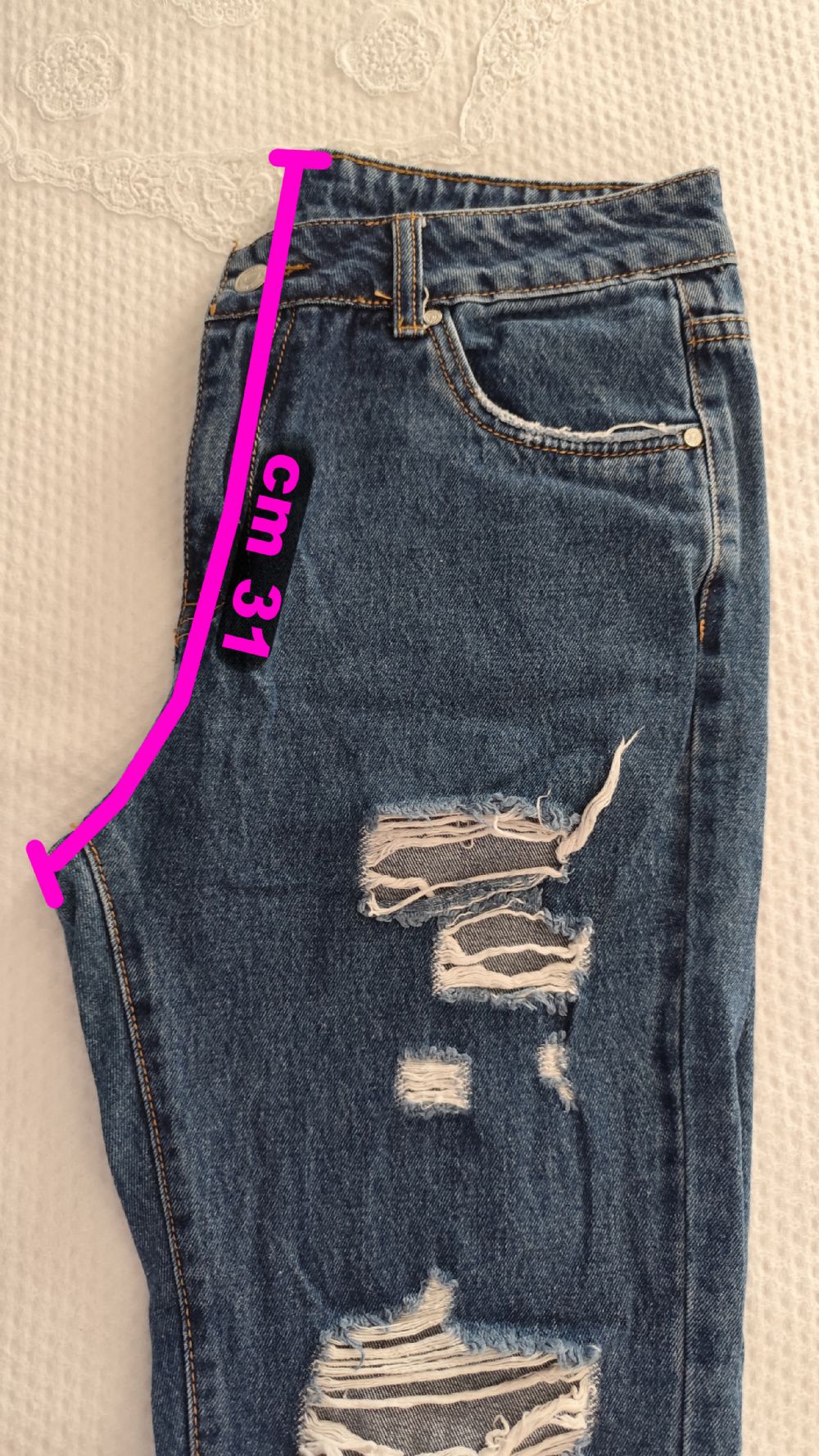 Descrizione:Pantalone jeans in denim unisex, modello 5 tasche mum-fit con abrasioni e strappi sulle cosce e sulle tasche. Tessuto non elasticizzato con lavaggio medio e strappi bianchi. Sportivo e versatile, è in perfetto stato, senza difetti.
