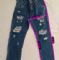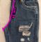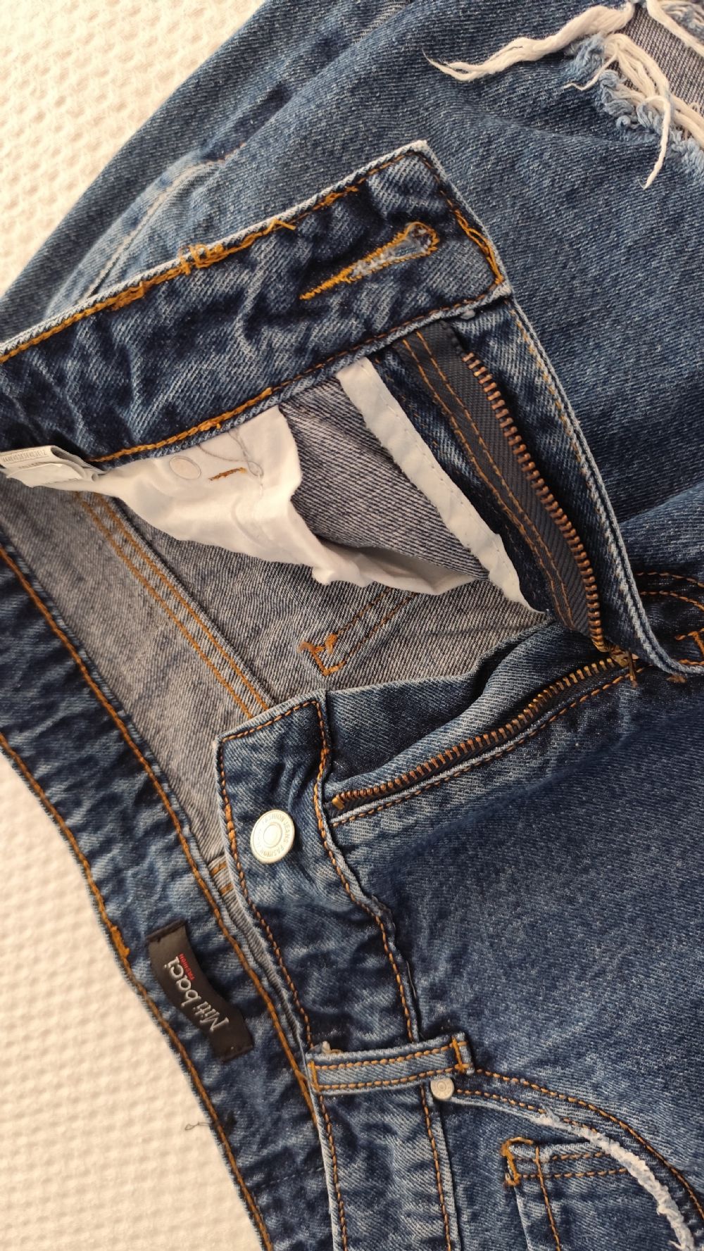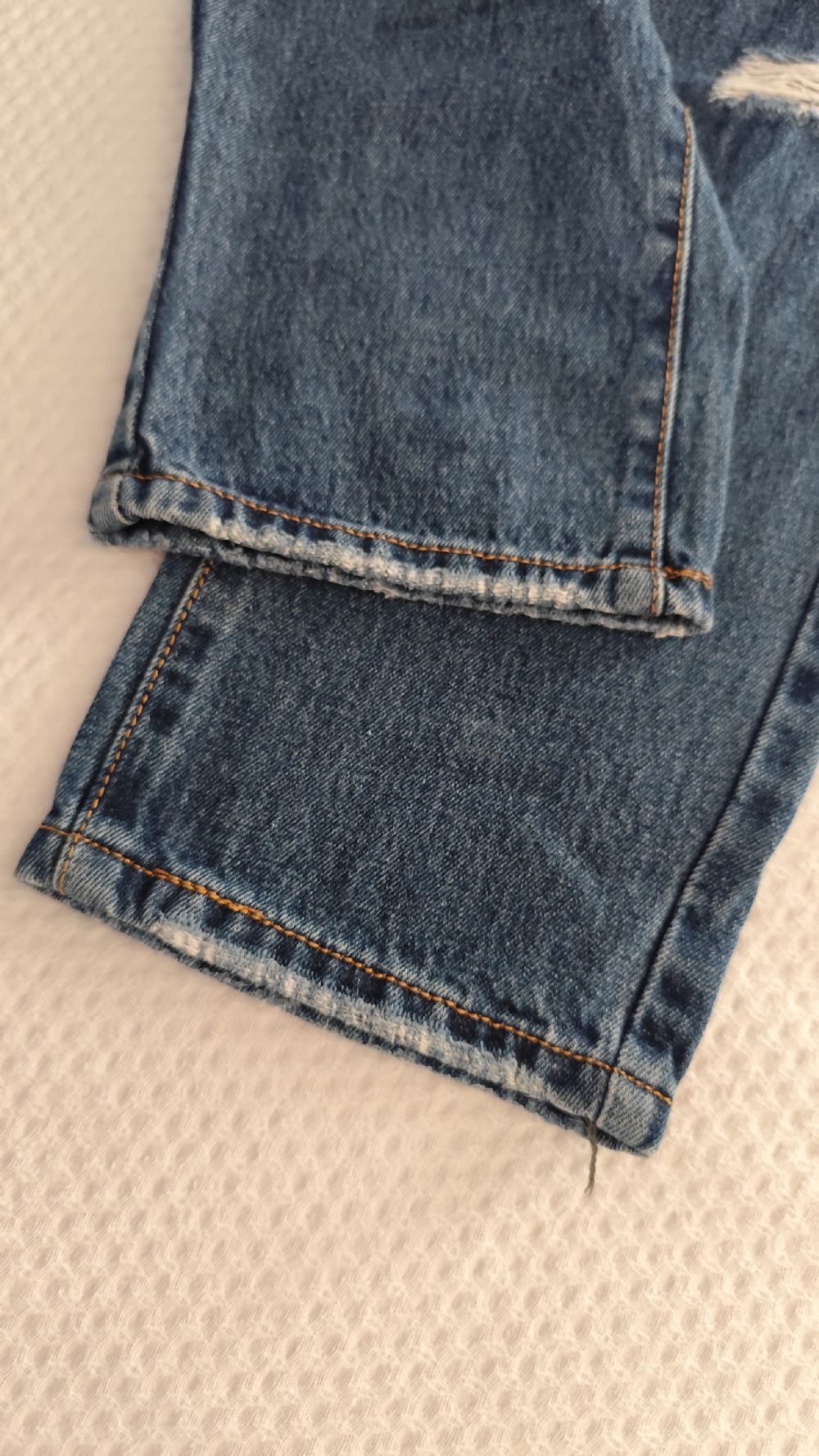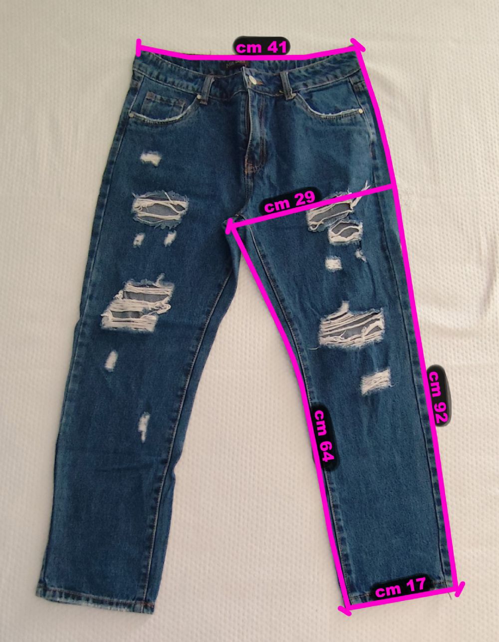 Descrizione:Pantalone jeans in denim unisex, modello 5 tasche mum-fit con abrasioni e strappi sulle cosce e sulle tasche. Tessuto non elasticizzato con lavaggio medio e strappi bianchi. Sportivo e versatile, è in perfetto stato, senza difetti.