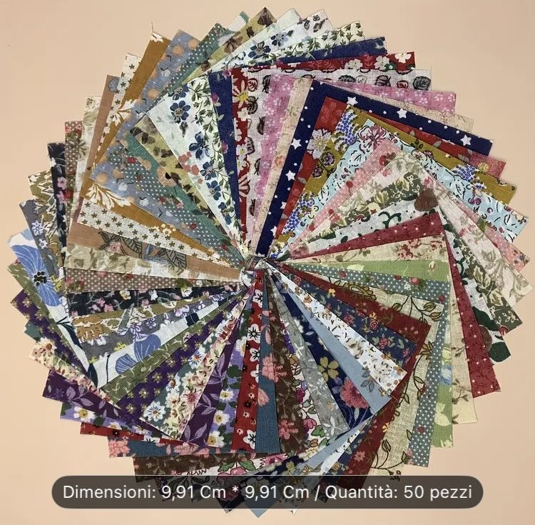 Sono 50 ritagli di stoffa nuovi di circa 10 x 10 cm.