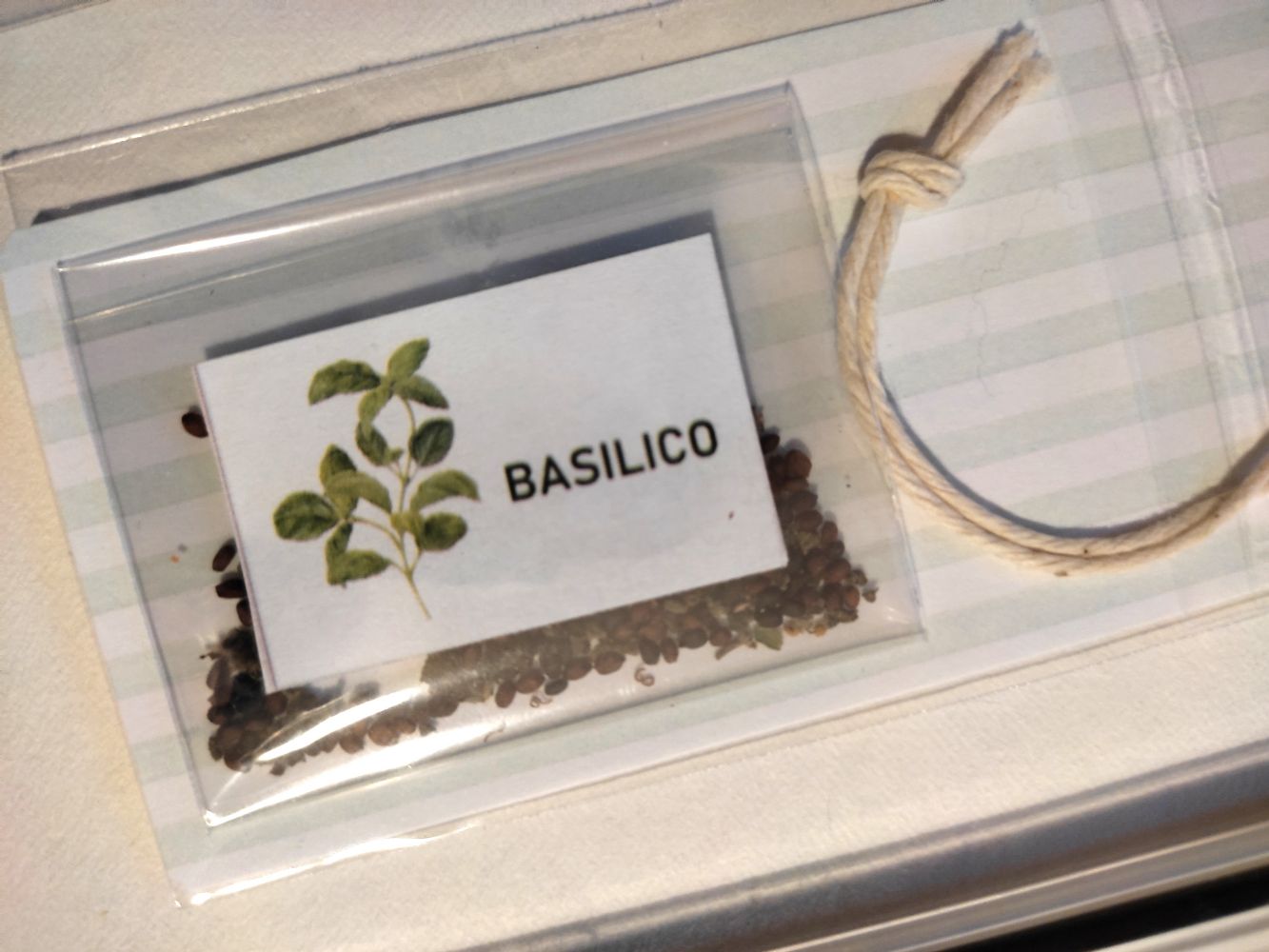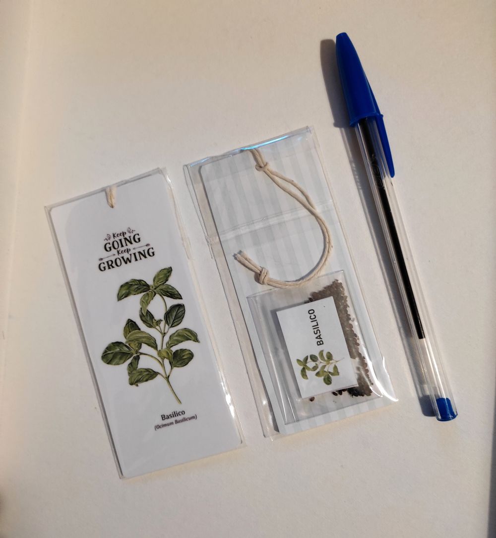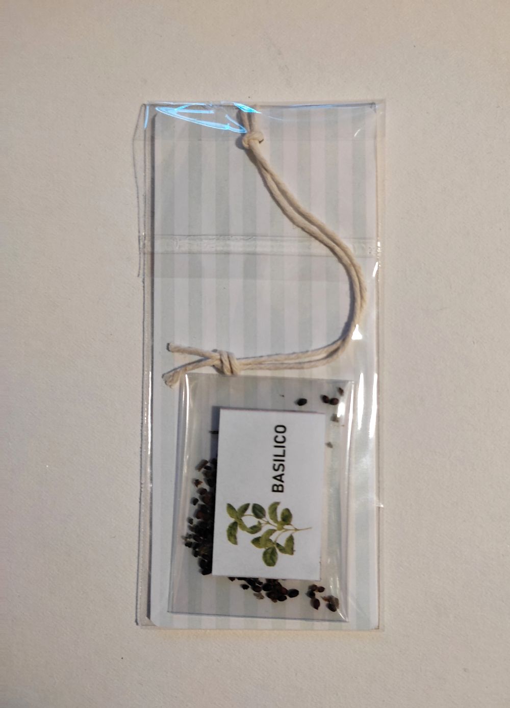Semi di basilico raccolti a fine dell'estate scorsa + segnalibro in cartoncino plastificato. Confezione con bustina trasparente regalabile.