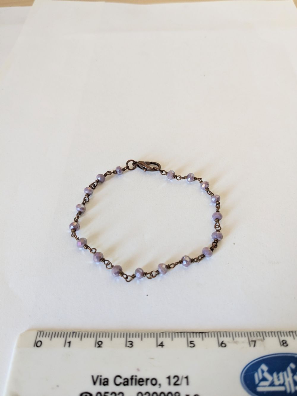 Descrizione:Bracciale composto da una catenina sottile in bronzo con pietre di colore lilla. Nessun difetto