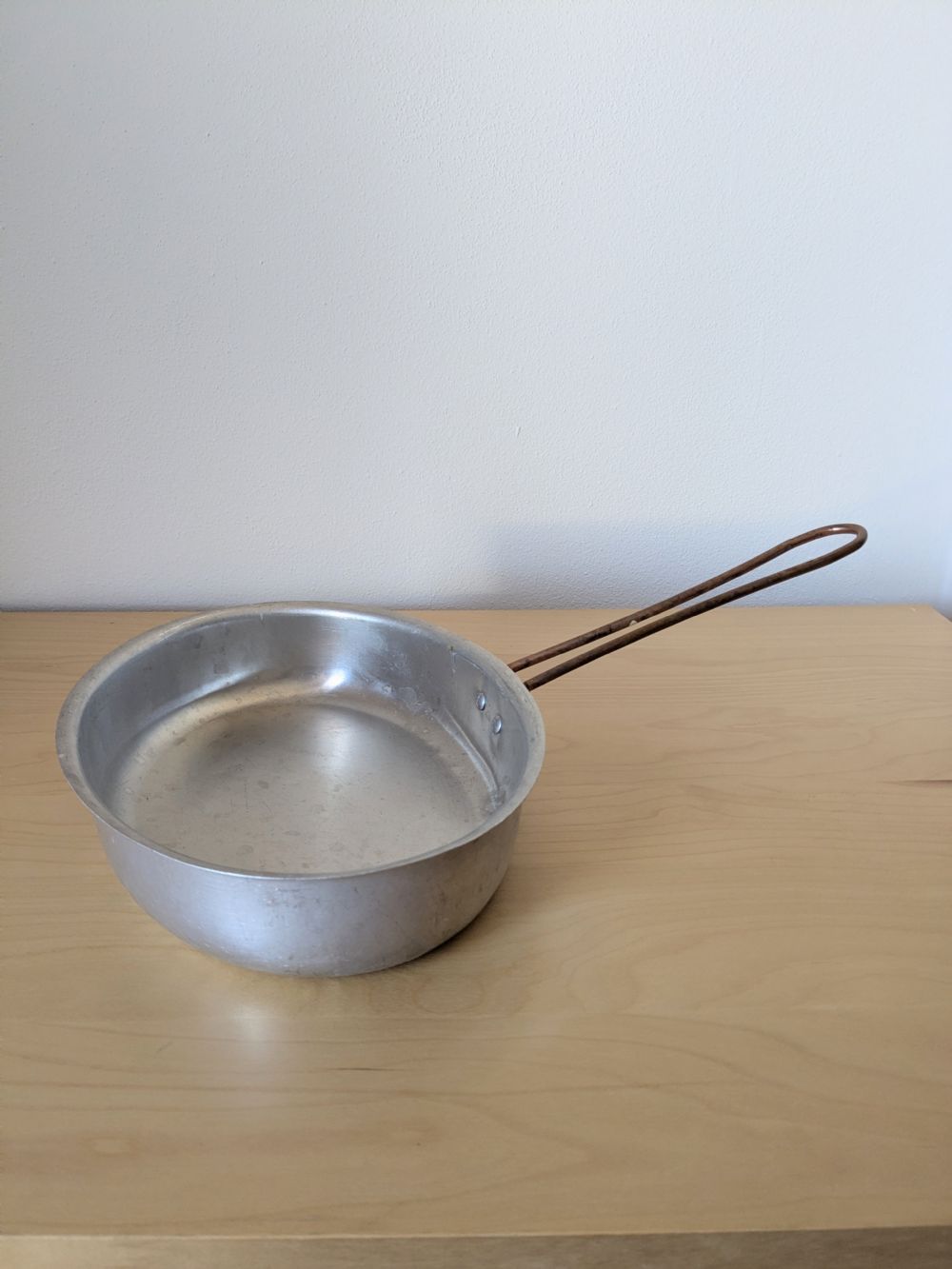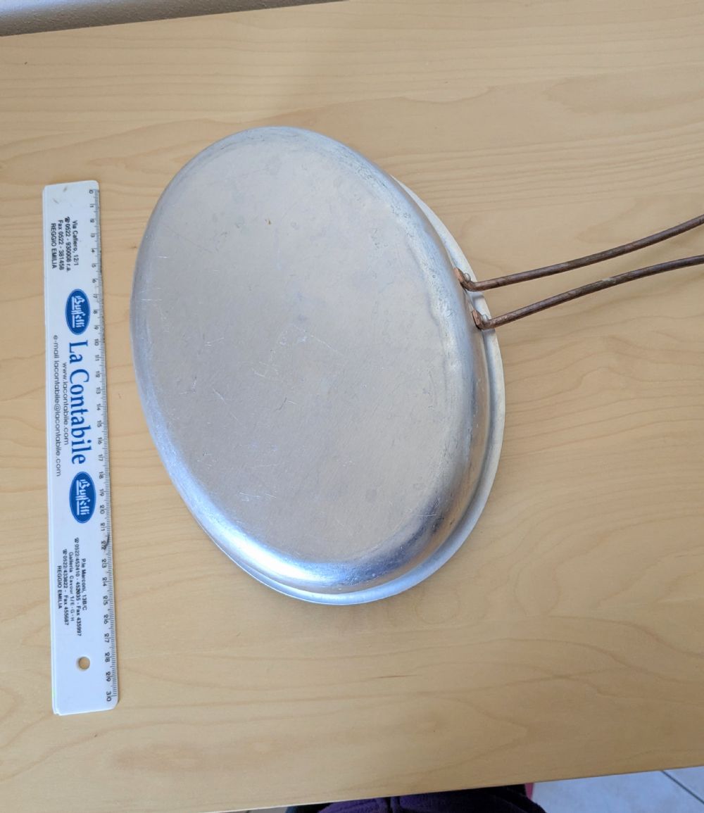 Descrizione:Padella in metallo, credo alluminio perchè è molto leggera, manico in rame. L'attaccatura del manico balla un pochino
