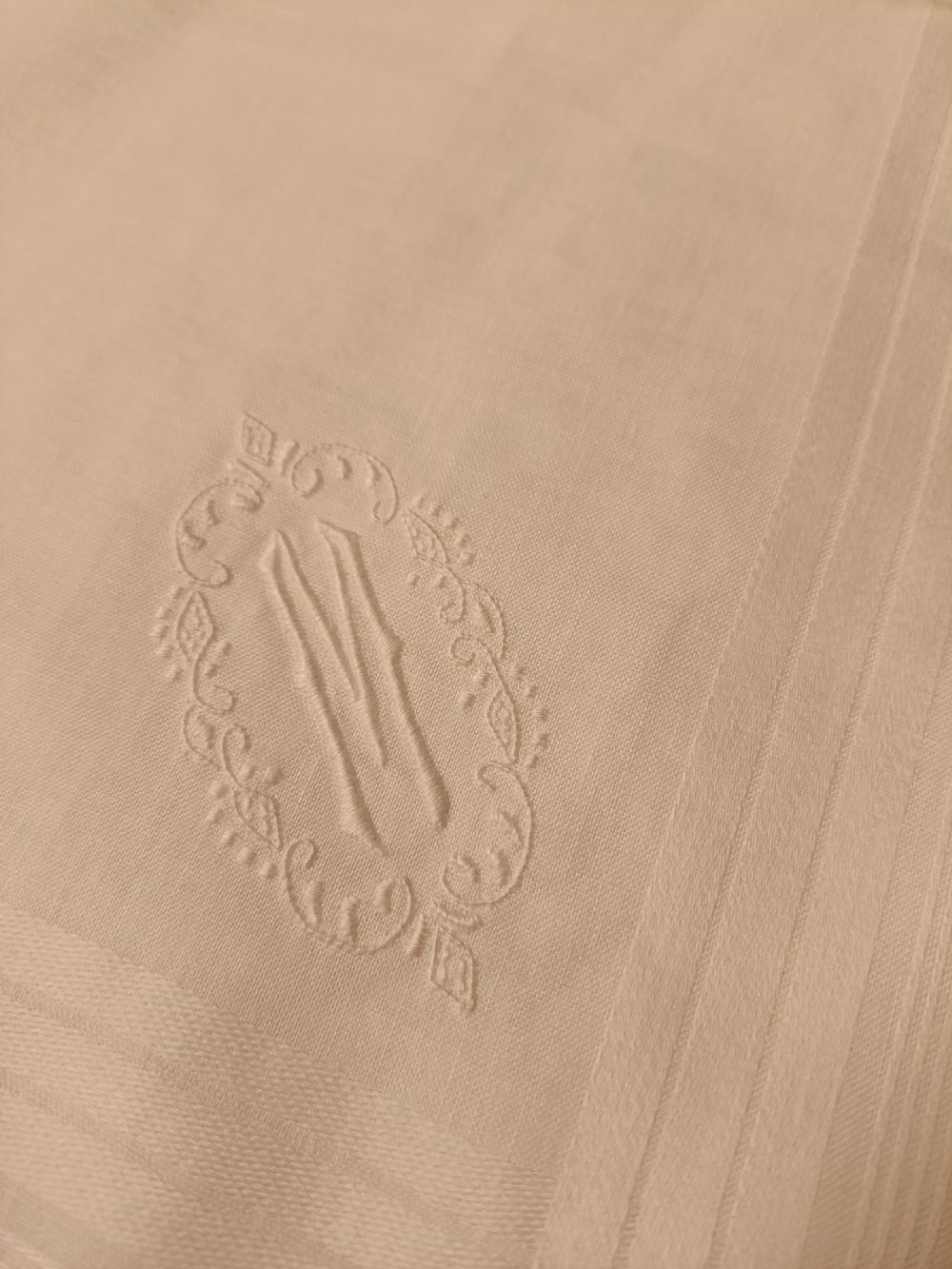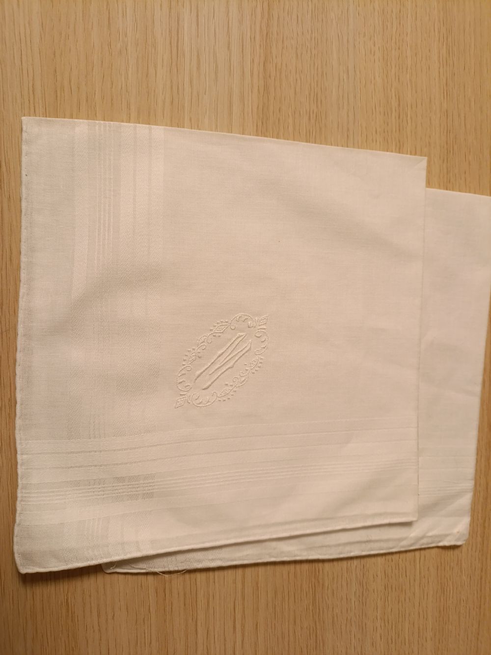 Descrizione:Due fazzoletti da uomo, in puro cotone, ricamati con l'iniziale M. 44x44 cm, nuovi ancora con l'appretto