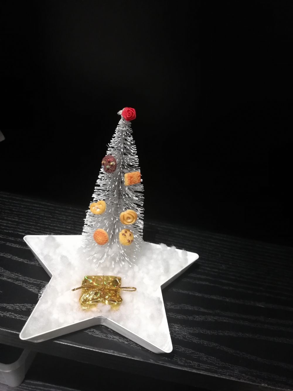 Descrizione:Albero sintetico alto 12,5 cm su stella in metallo larga 12,5 cm e decorata con neve finta e pacchetto regalo. I biscotti sull'albero sono in resina.