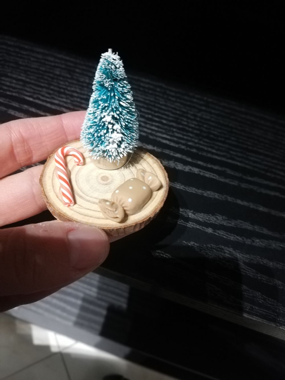 Albero sintetico alto 4 cm su base in legno larga 4,8 cm con caramelle in resina