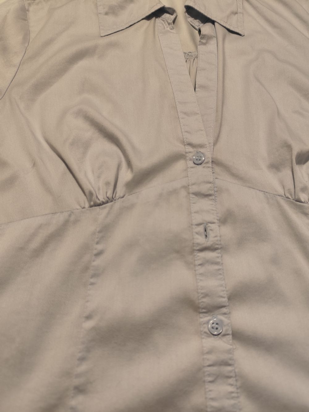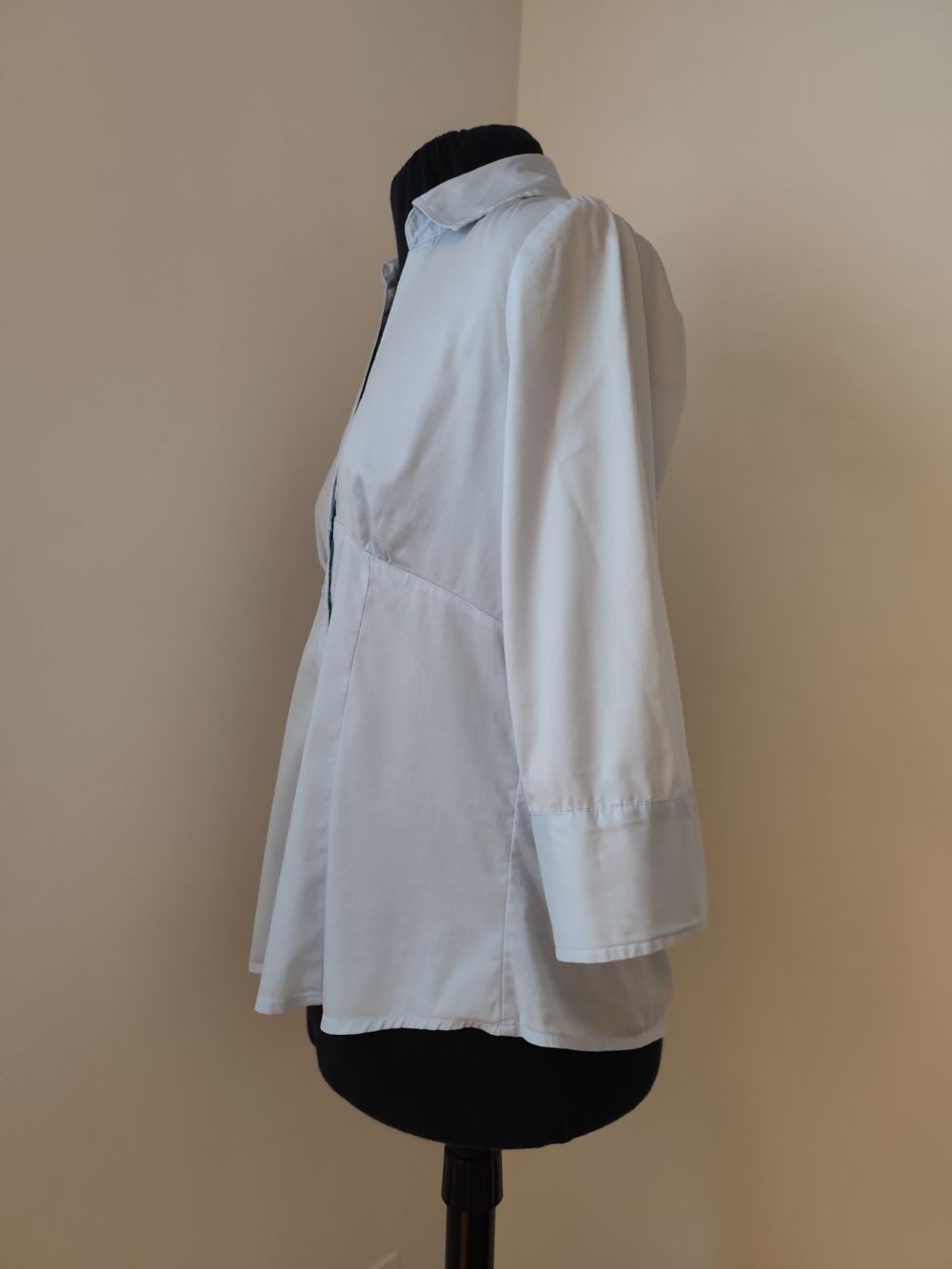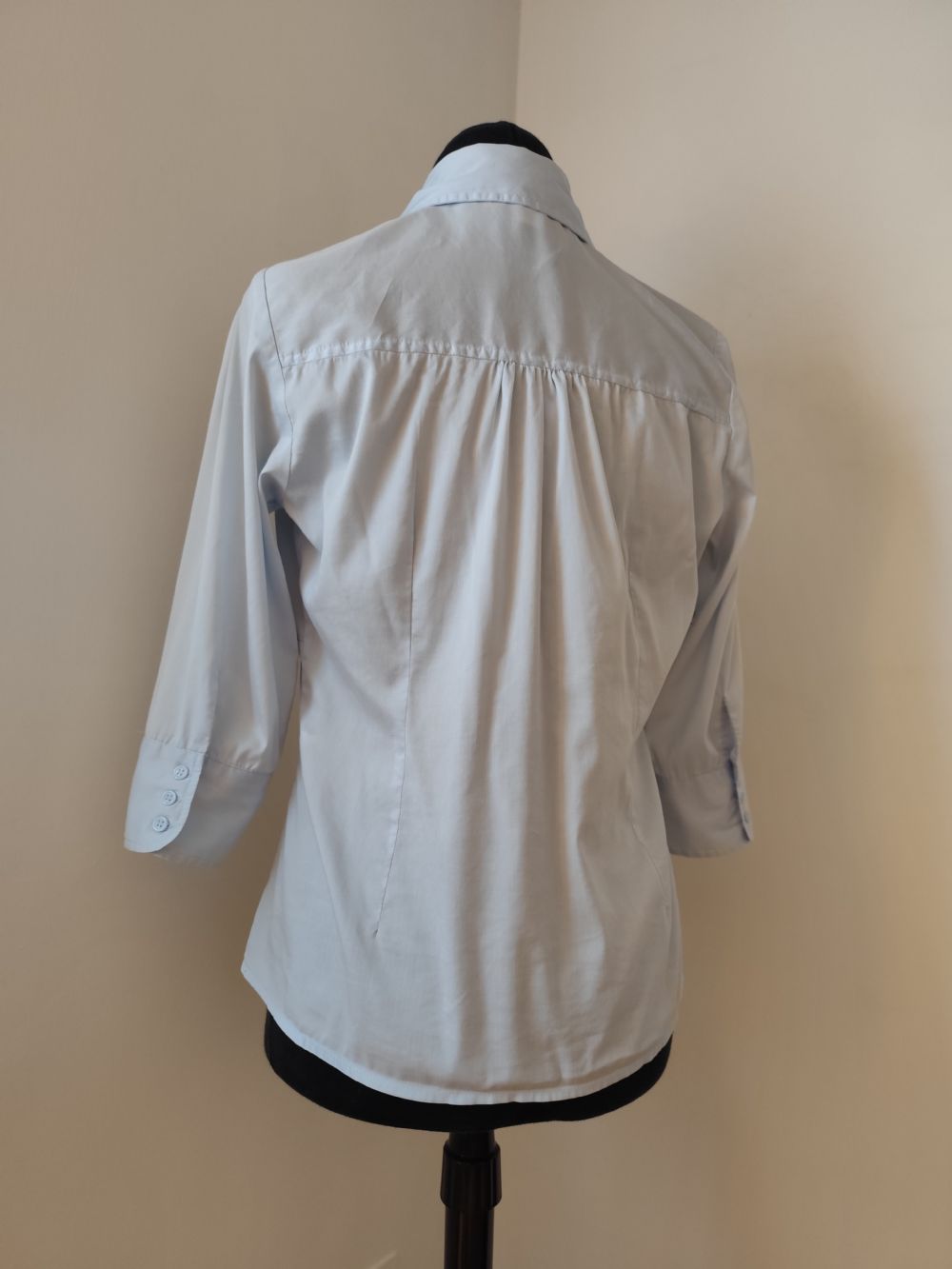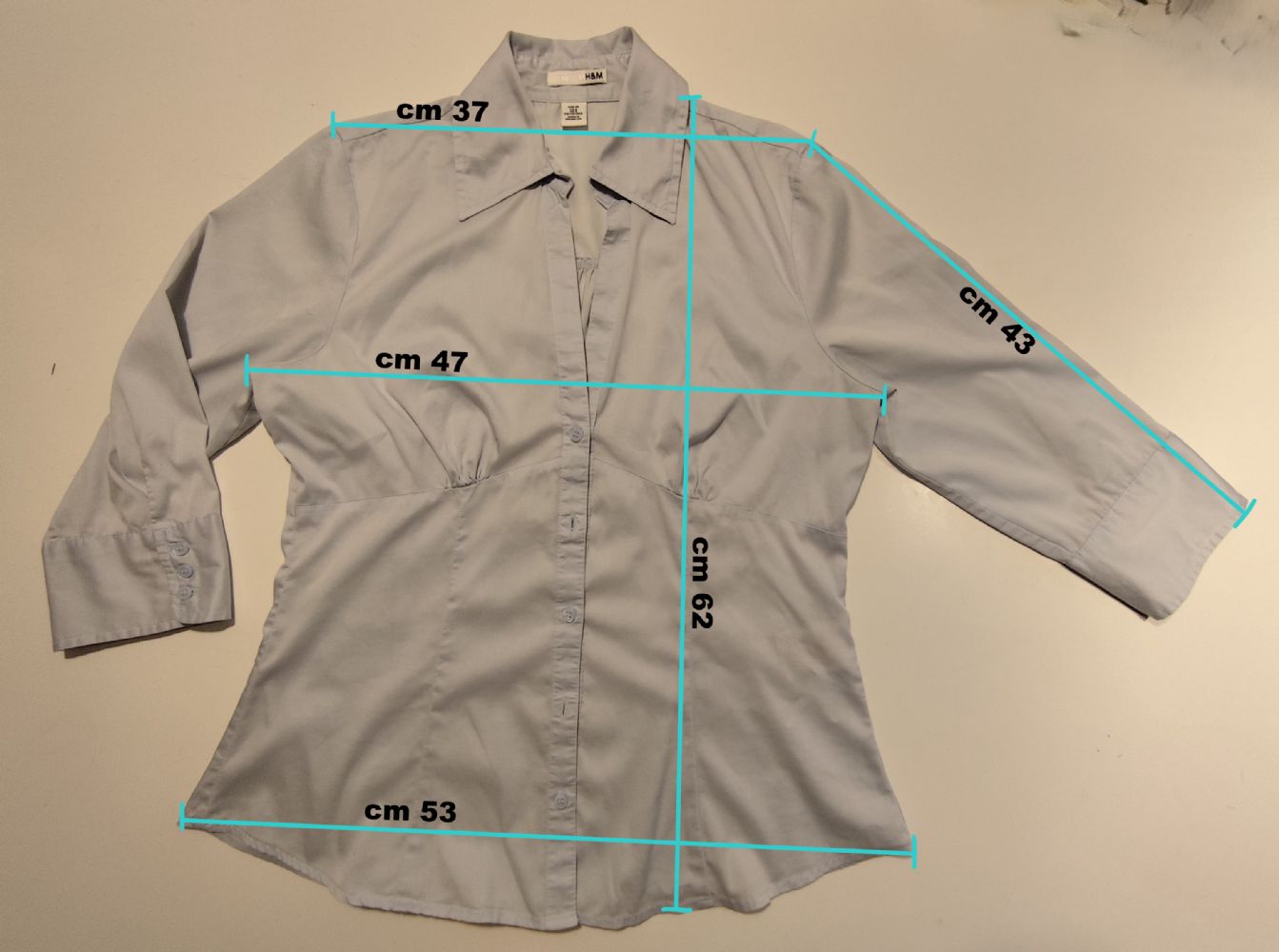 Descrizione:Camicia da donna leggera, azzurra, modello aderente in vita con arricciatura al seno, scollatura a V e svasata al fondo, maniche a tre quarti con polsino. Particolare e versatile per uno stile elegante e casual, non ha difetti.