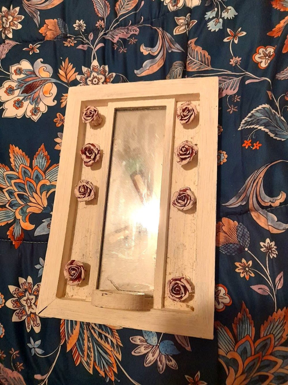 In legno con roselline 28x19 cm con spazio sotto per mettere qualcosa, forse una tea light Sembra scuro, ma è bianco nel link altre foto