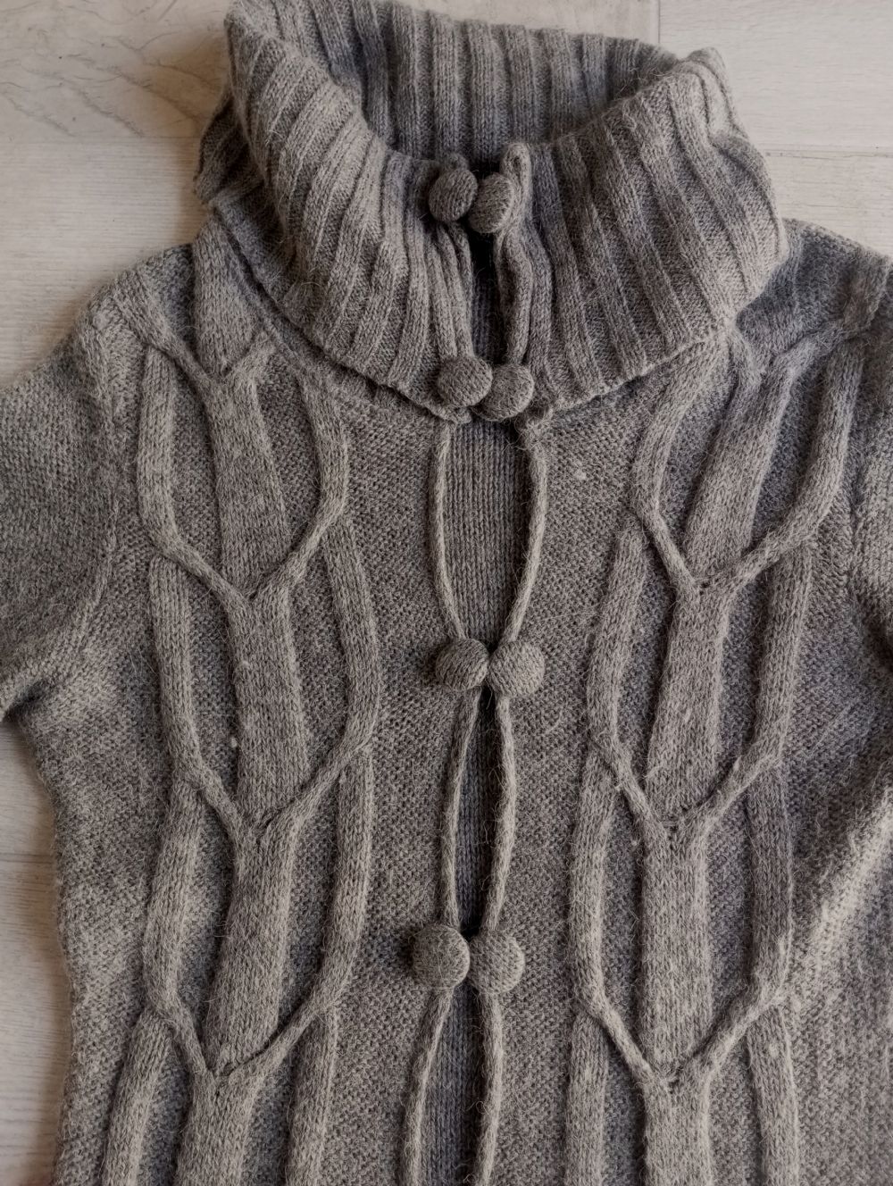 bel collo avvolgente e chiusura con doppi bottoni rivestiti