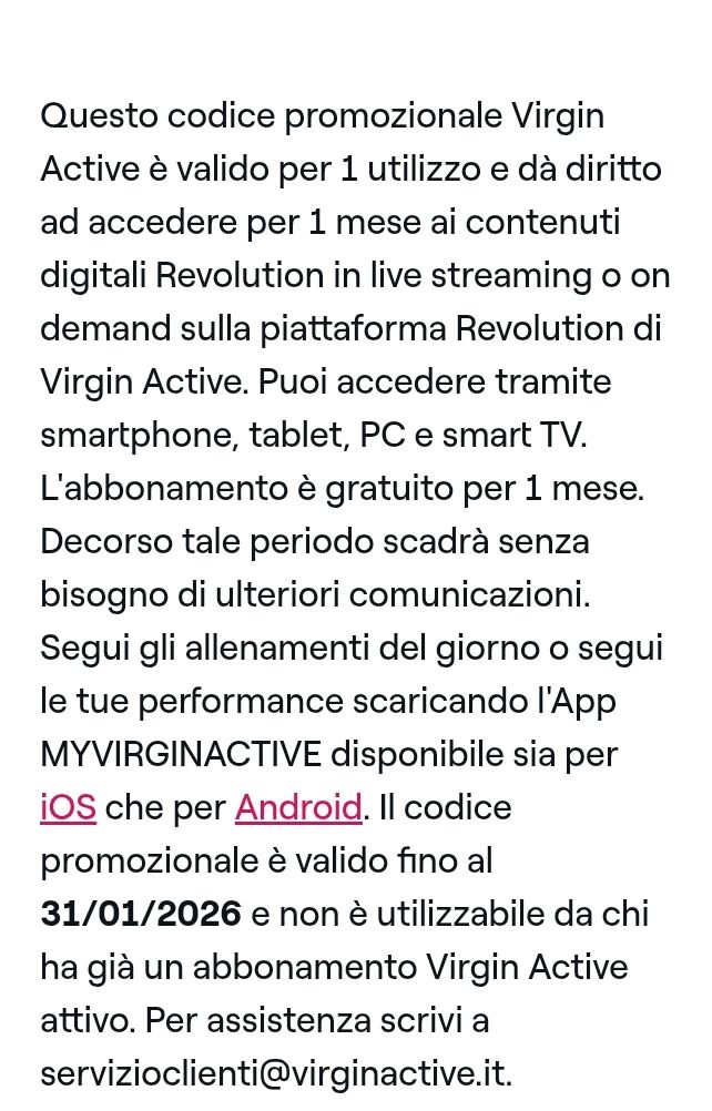 Descrizione:Un mese di abbonamento Virgin Active Revolution per allenarti dove vuoi.