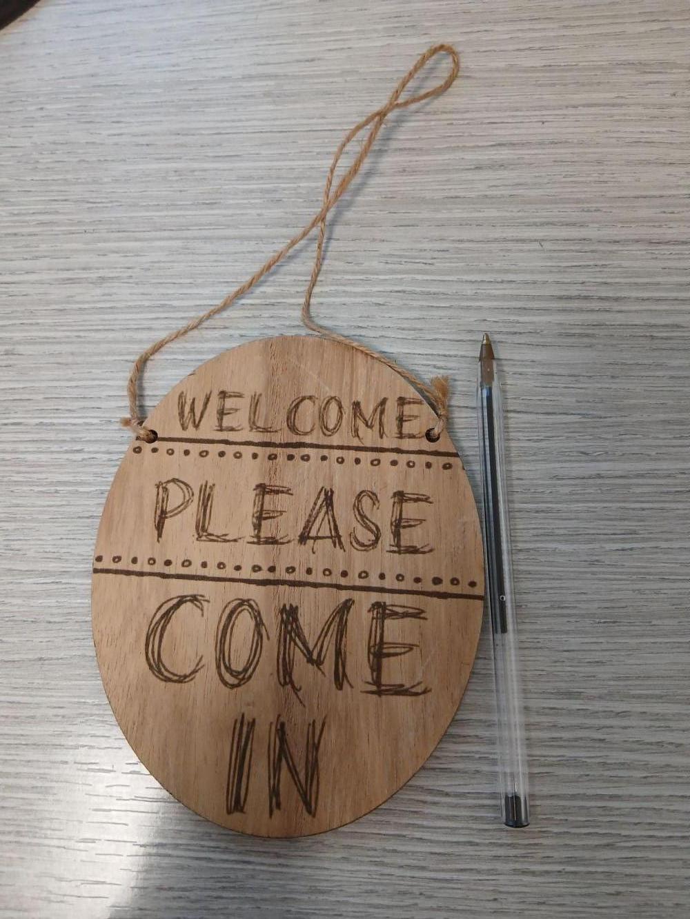 Descrizione:In materiale simil legno (compensato) spessore 0,5 cm, la penna per le dimensioni. La scritta non è a penna o pennarello, sembra serigrafata. Con cordino per appendere al muro.