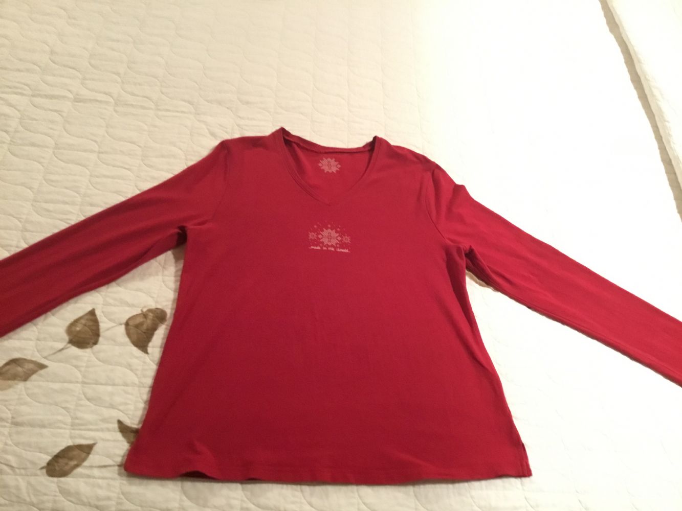 Descrizione:Maglietta rossa a V, con disegno sul davanti. Indicata tg 40/42, ma secondo me veste di più, direi tg M/L, comunque controllate le misure: spalle 41, ascelle 47, lunghezza 65, larghezza al fondo 52 con piccoli spacchetti ai lati.