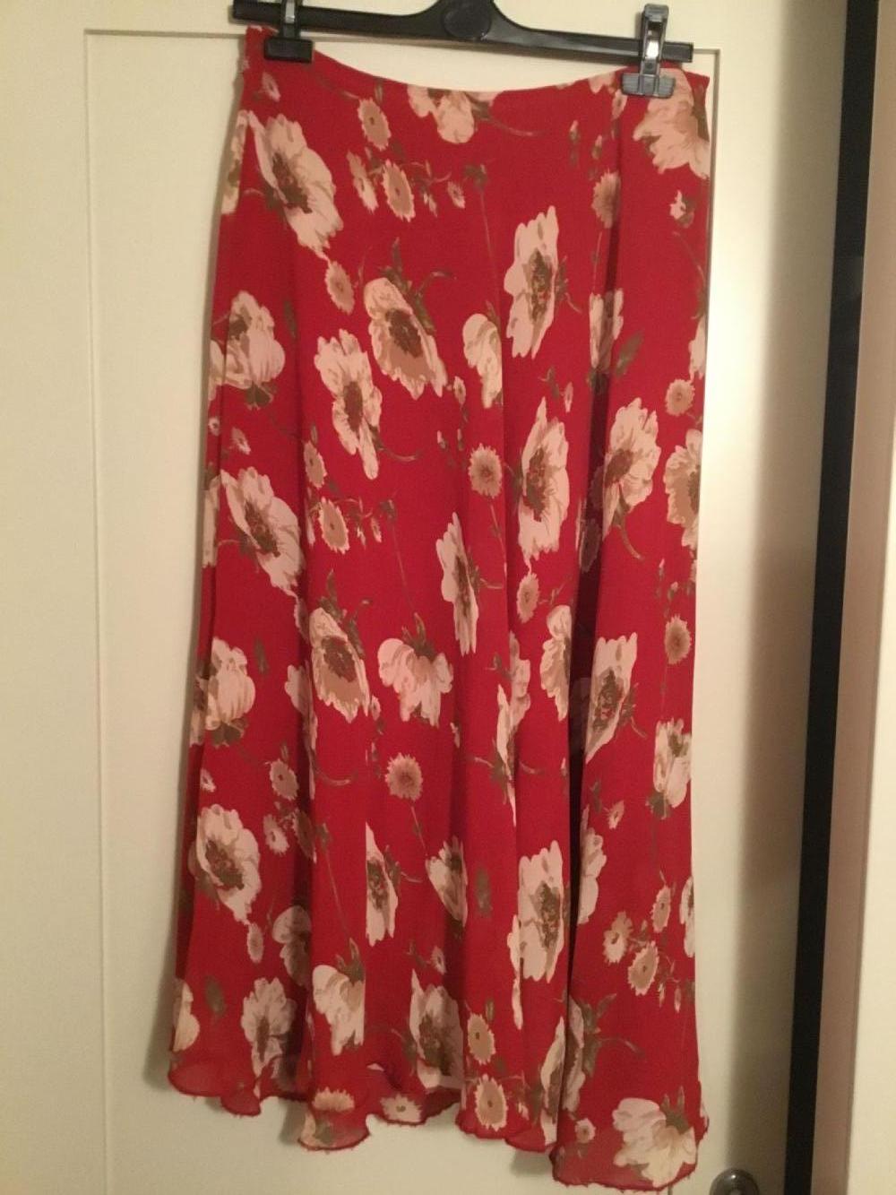 Descrizione:Gonna lunga estiva a fantasia floreale su fondo rosso, 100% viscosa. Fodera all’interno.