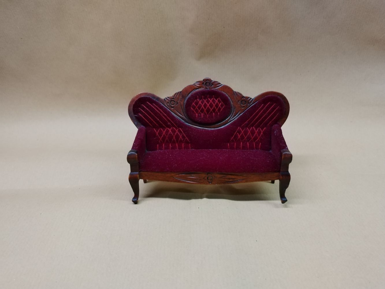 Divanetto in miniatura da collezione in velluto rosso larghezza 12 cm circa la penna e' per comparazione