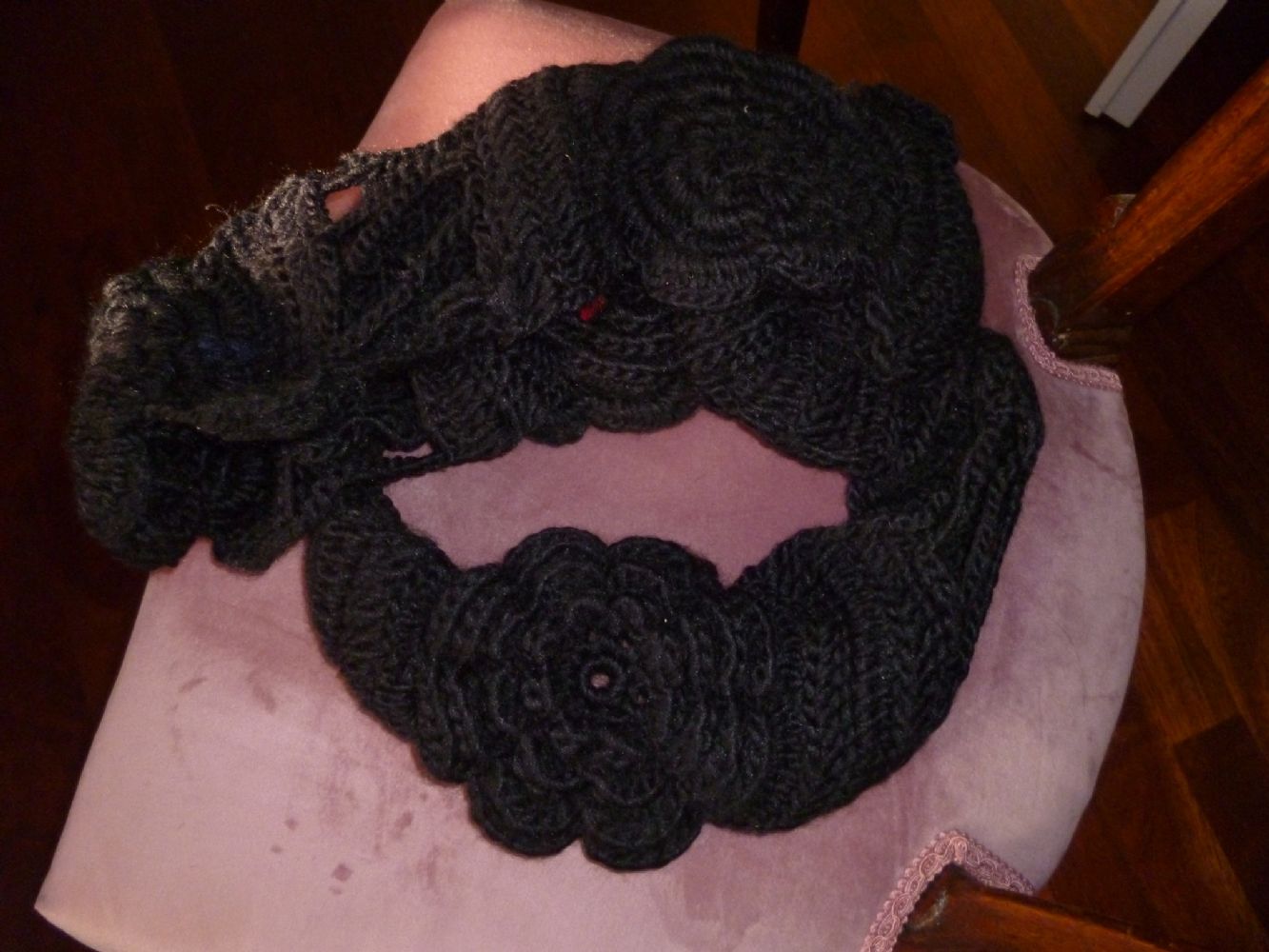 Descrizione:Sciarpa in acrilico nera formata da fiori, mai usata. Altezza 12 cm