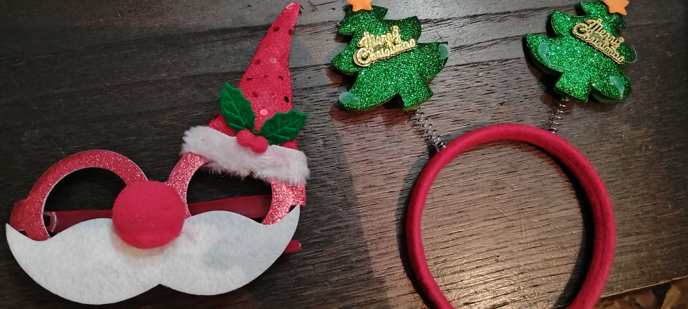 Descrizione:Cerchietto natalizio a cui mettere un po' di colla a caldo agli alberelli perché si è aperta la base e occhiali che hanno perso il campanello