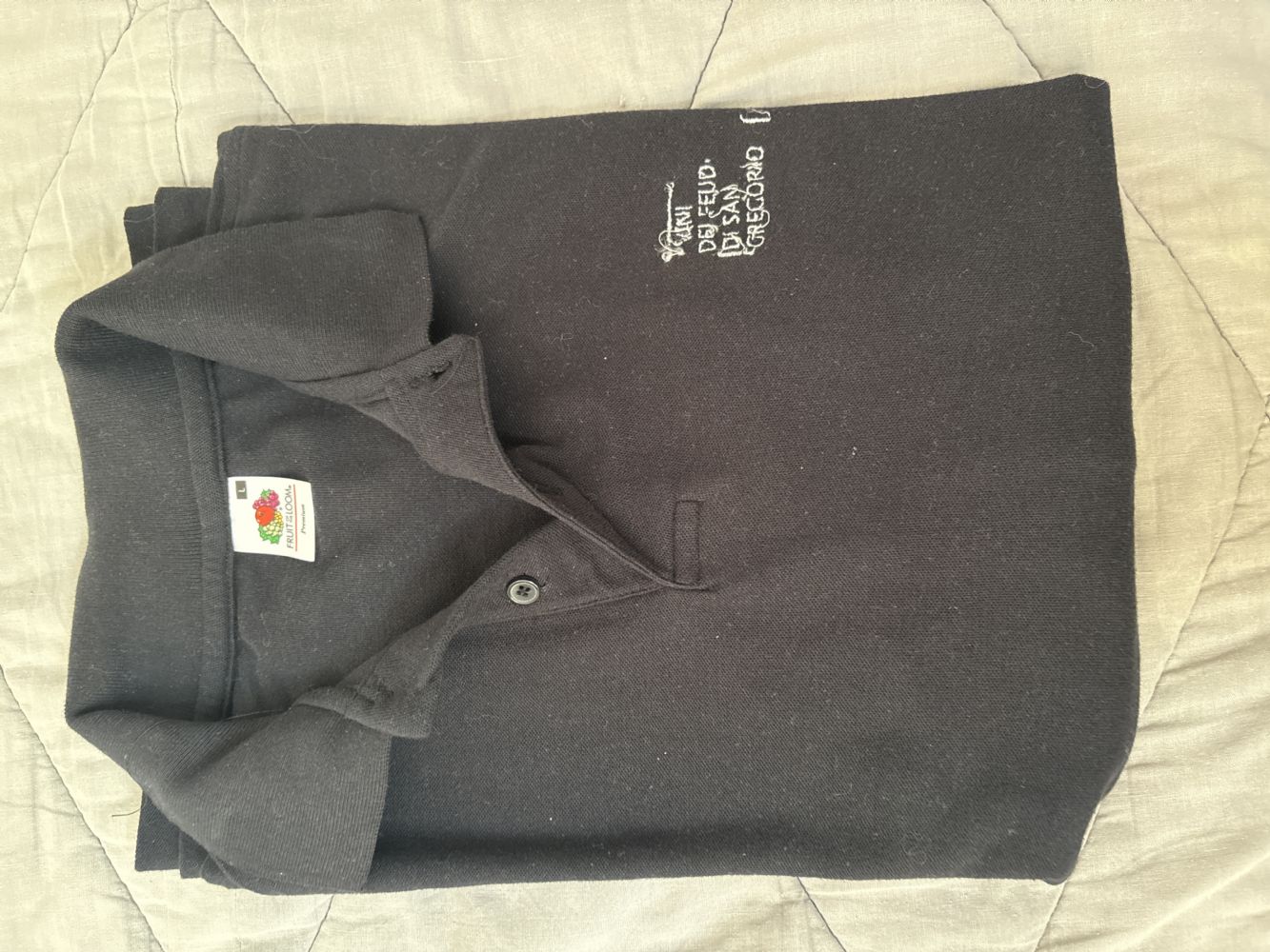 Descrizione:Polo nuova ma con ricamo un po’ sfilacciato (logo della cantina Feudi di San Gregorio).