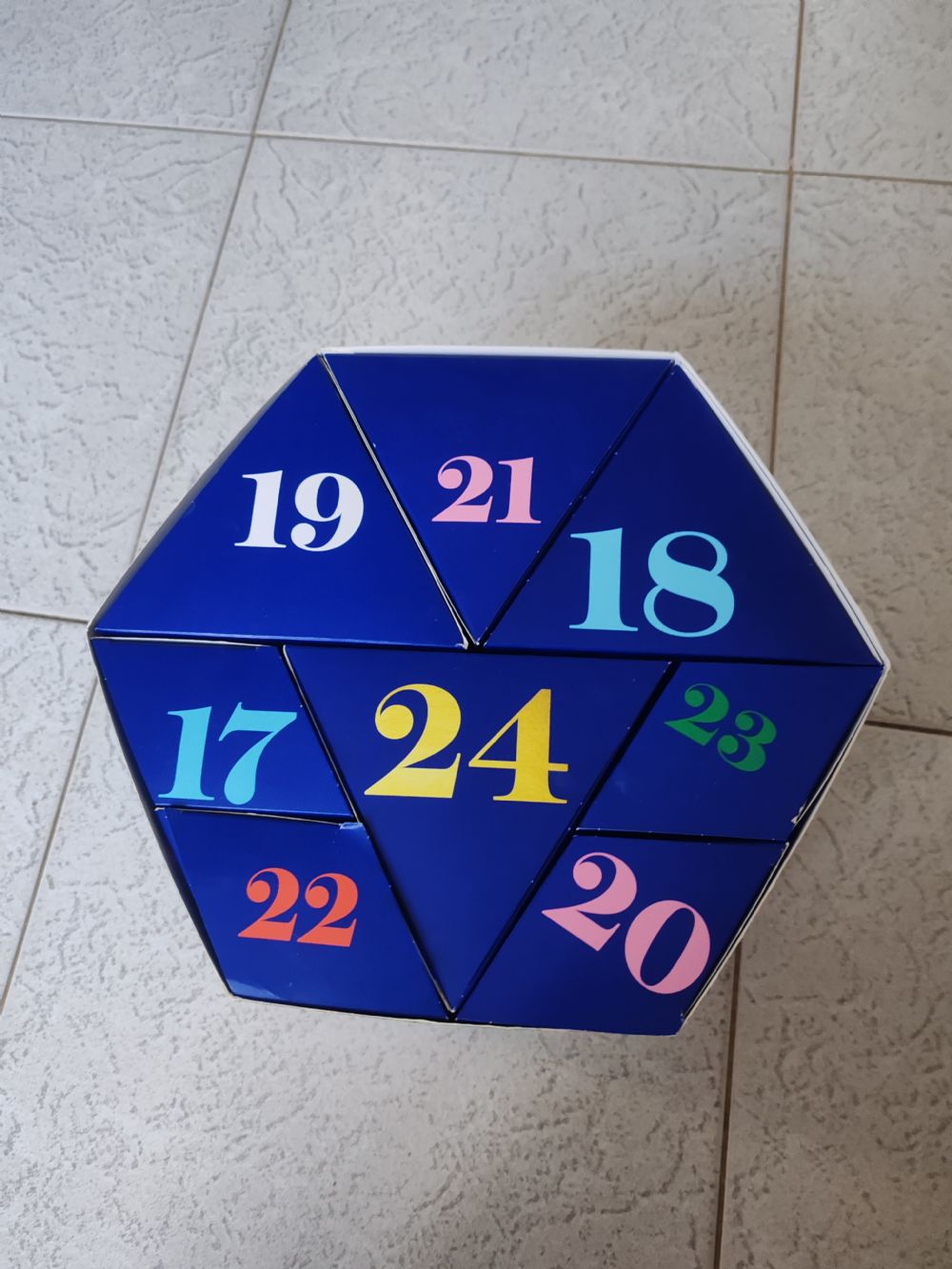 Descrizione:Calendario dell'avvento che conteneva prodotti da bagno. É formato da scatoline singole incastrate a torta. Può essere riempito con altri prodotti. La parte esterna con logo può essere rimossa, copre le due torte