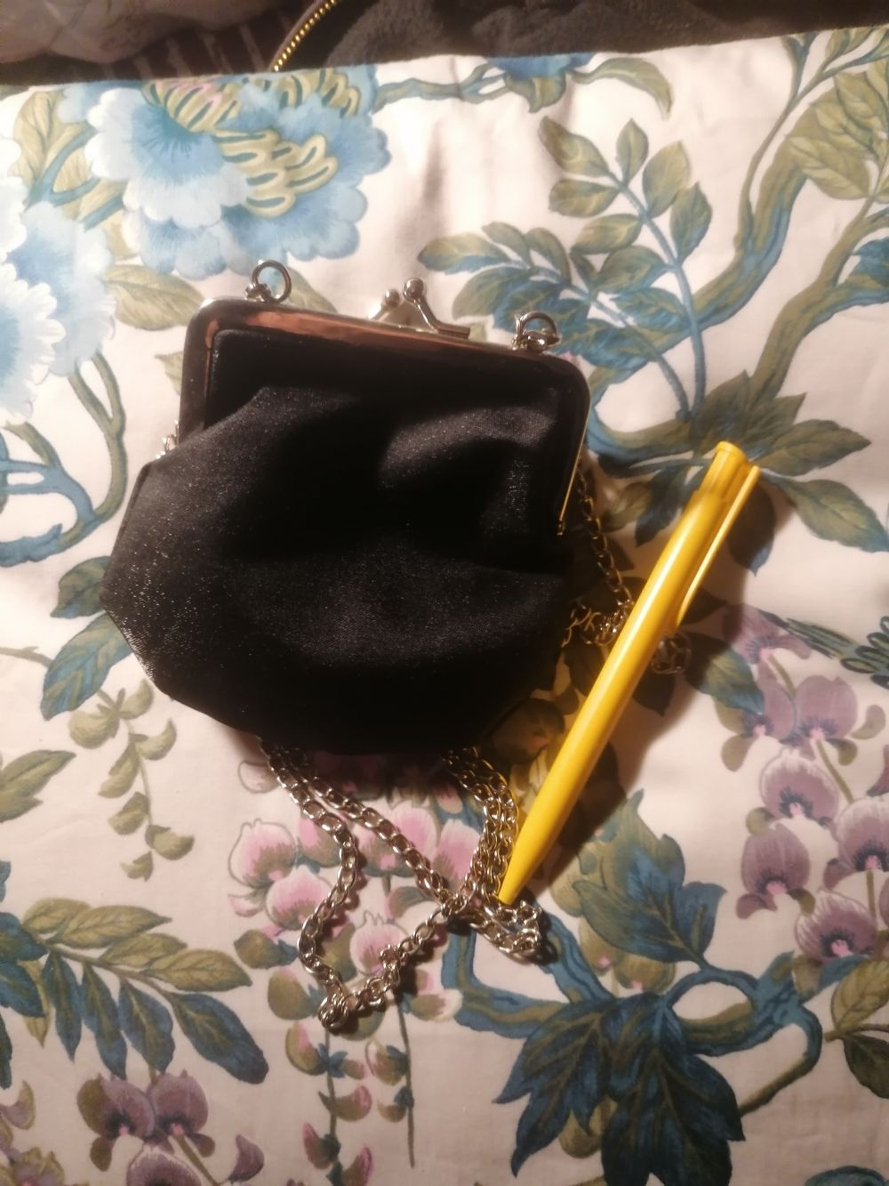 Descrizione:Borsellino clik clak, in tela lucida nera con catenella, da portare a tracolla, anche di sera. Mio, usato poco. Pari a nuovo. Penna per misura.