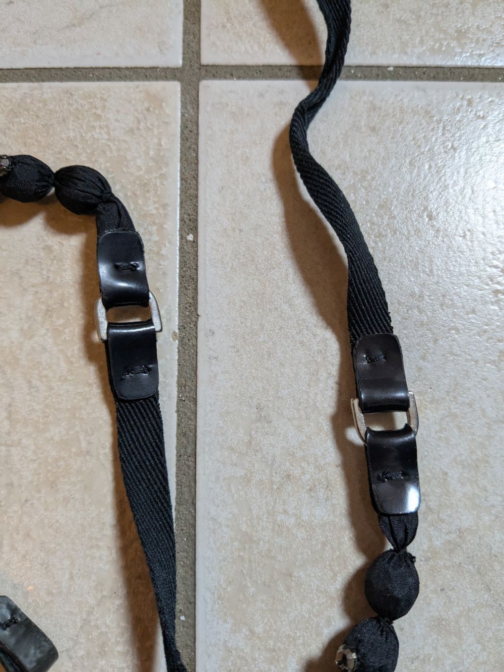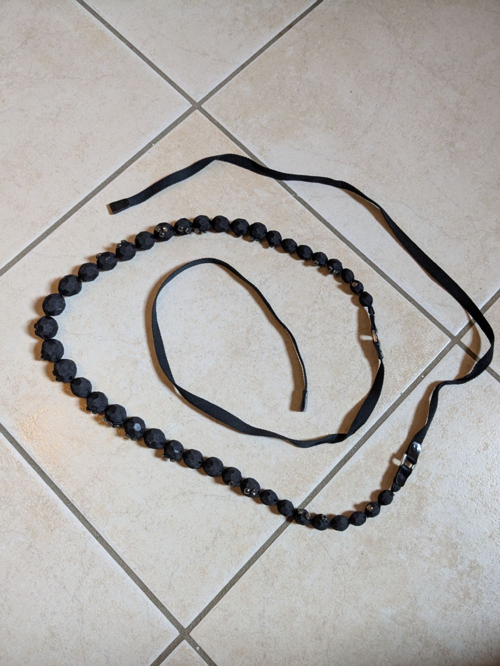 Gli elementi (piuttosto pesanti quindi vetro o pietra) sono ricoperti, il nastro è in robusta fettuccia nera. Qualche pietrina decorativa manca ma al colpo d'occhio non si vede, per questo ho messo usato poco.