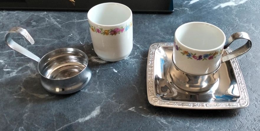 Servizio da 12 tazzine vintage in porcellana e acciaio. Come vedete la tazzina è senza manico poi si inserisce nel suo reggi tazzina e sul piattino in acciaio