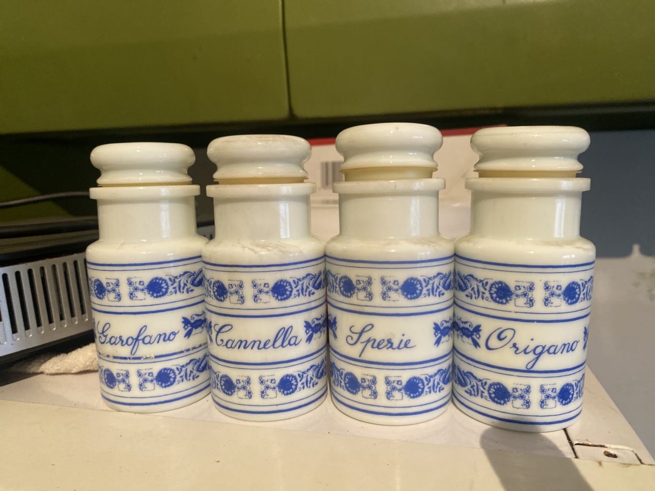 Descrizione:Vasetti porta spezie, mai usati ma sulla foto molto impolverati. Ovviamente pulisco prima di consegnare. 12 × 5 cm circa.