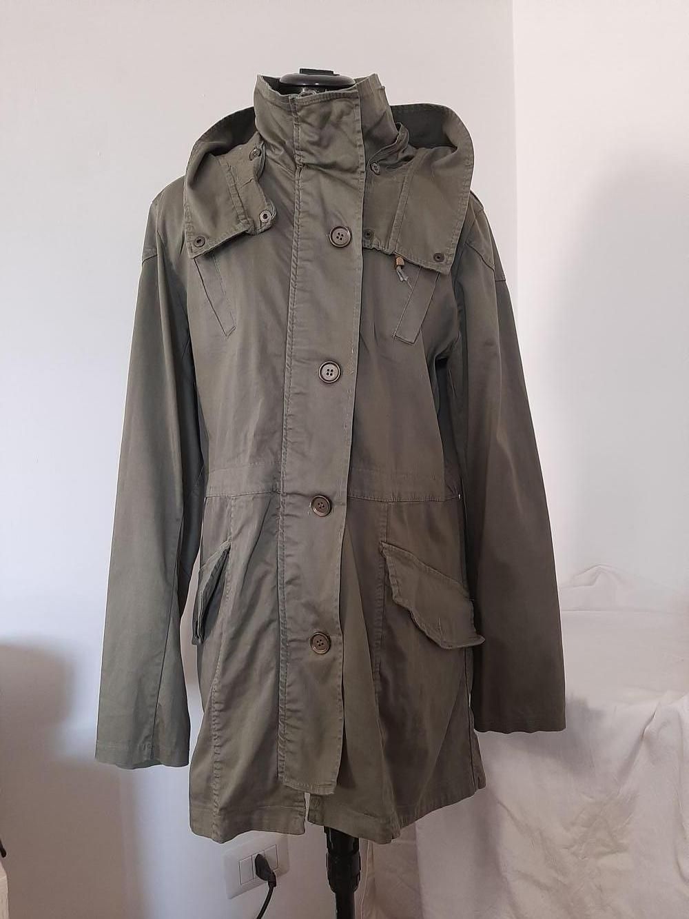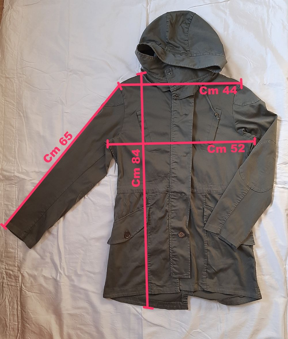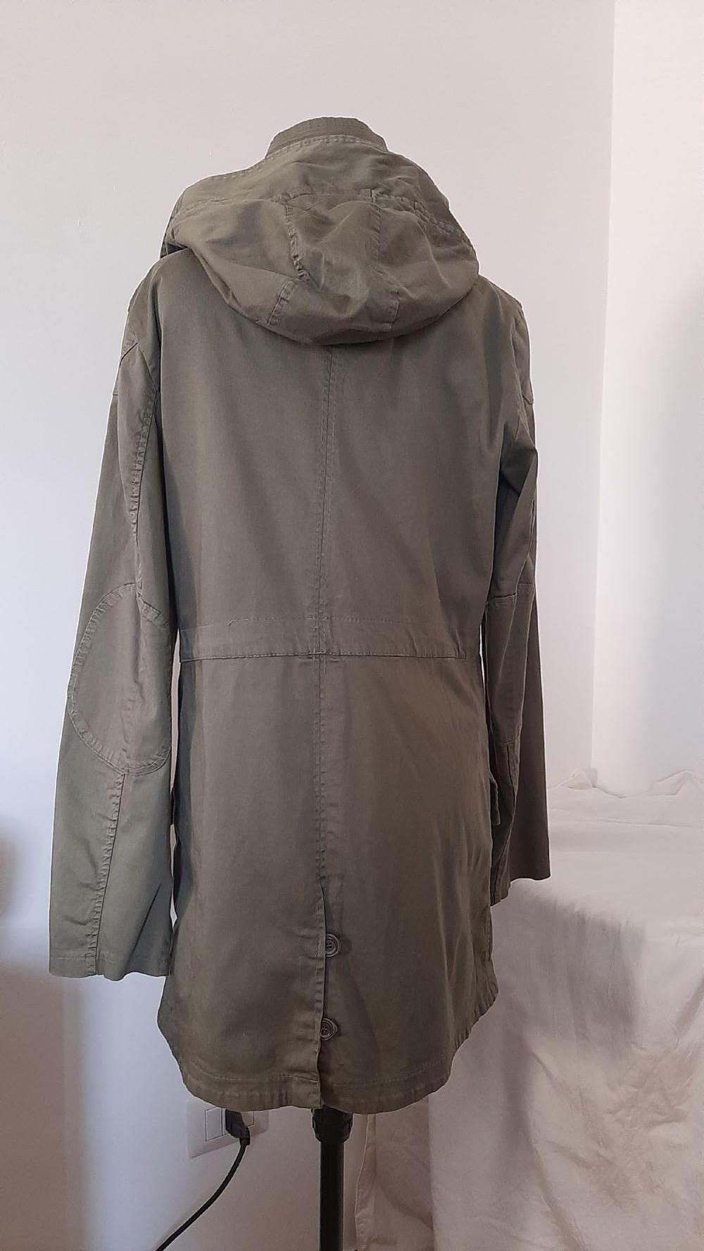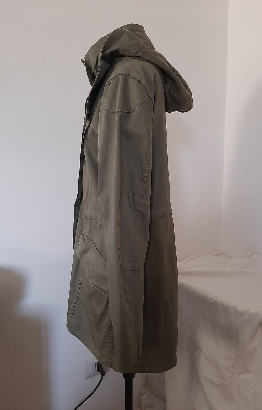 Descrizione:Giacca lunga in cotone leggero verde militare. Bel modello con cappuccio staccabile, chiusura con zip in metallo e bottoni, in vita ha una coulisse con laccetto per arricciarla.