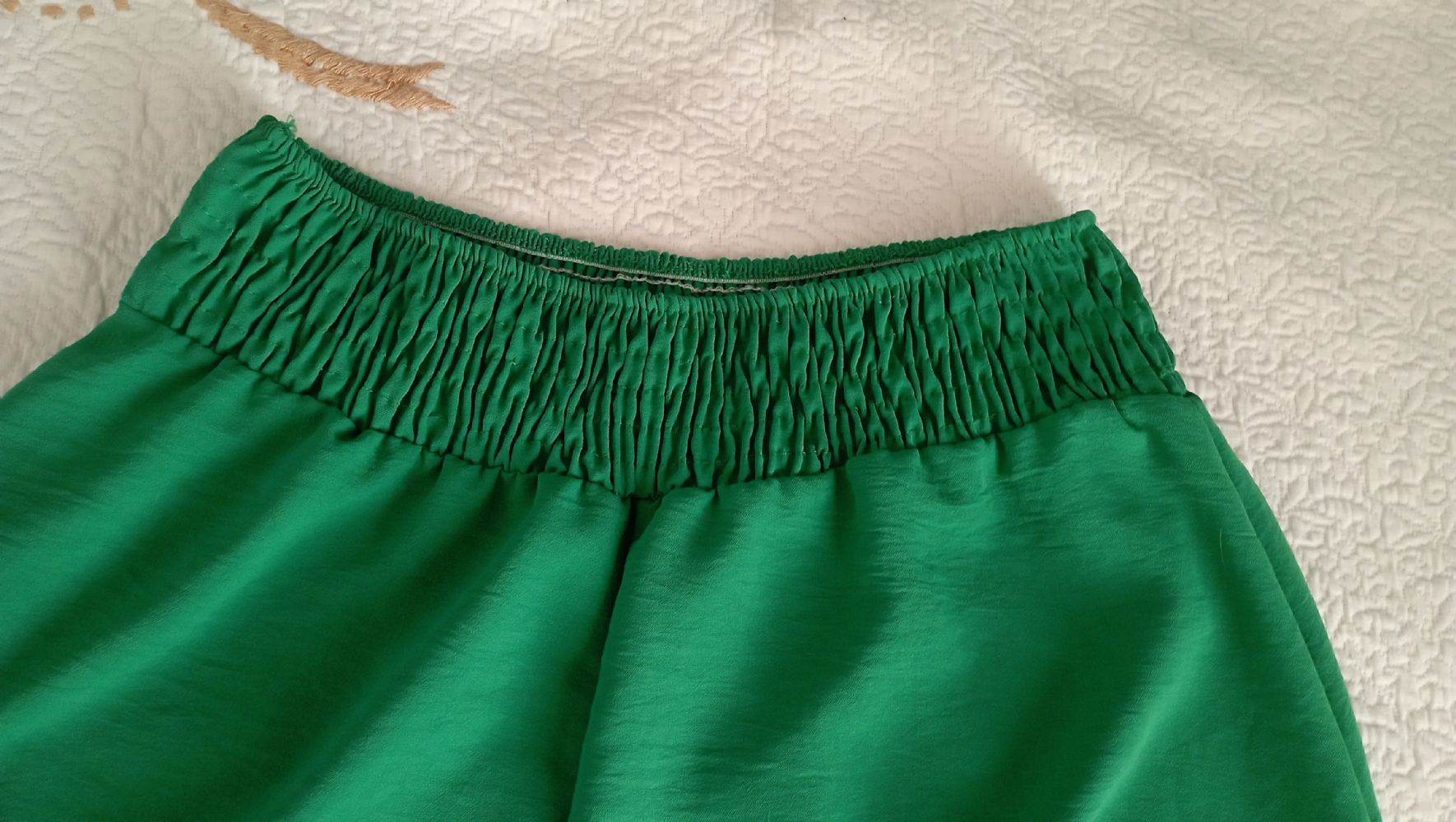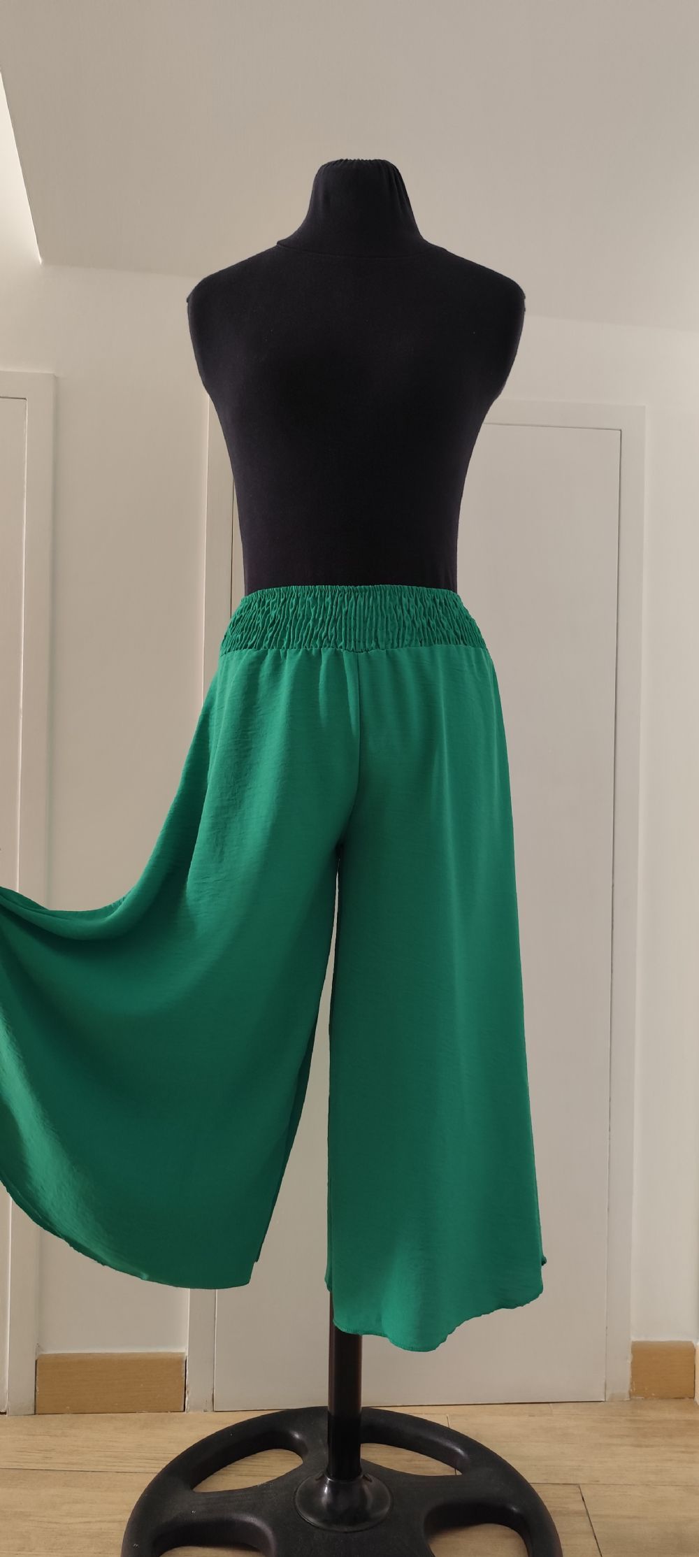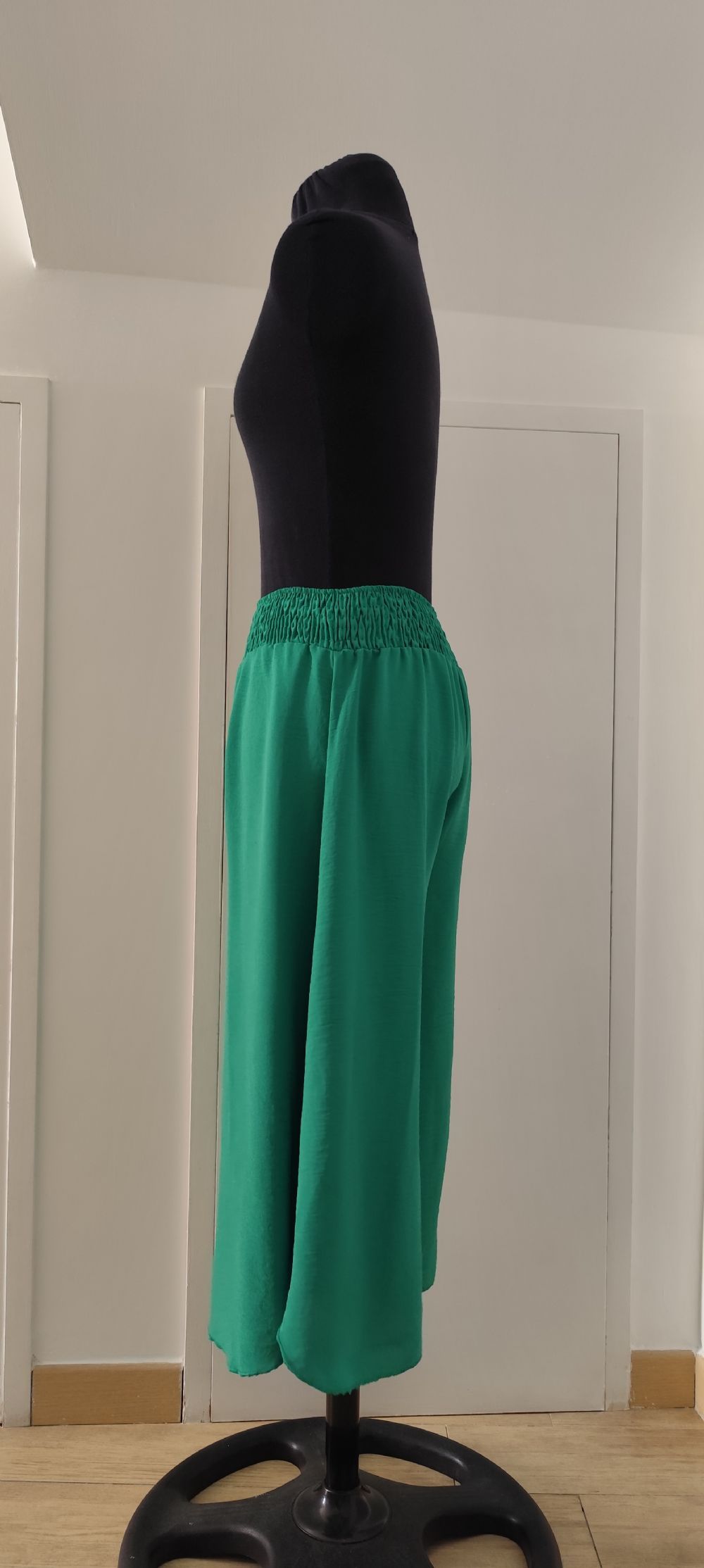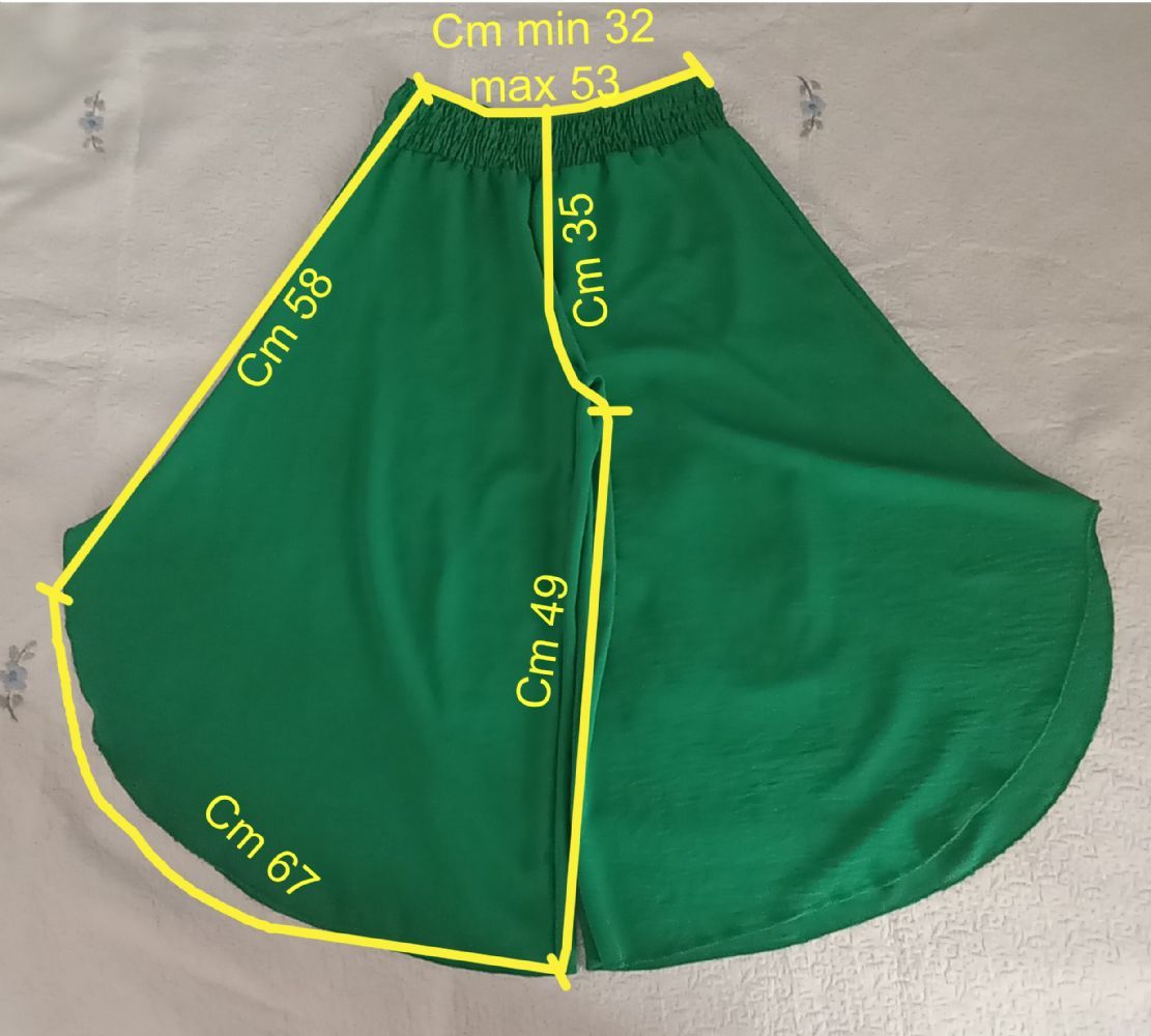 Descrizione:Descrizione:Gonna pantalone verde, molto ampia e comoda con fondo arrotondato, corta al polpaccio. Con larga cintura in vita arricciata da diverse file di elastico sottile tubolare, perfetto per la quotidianità.