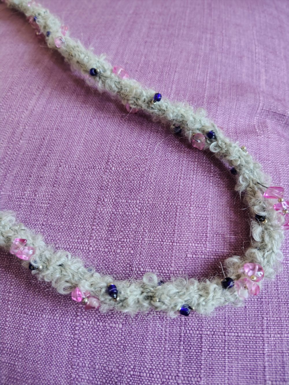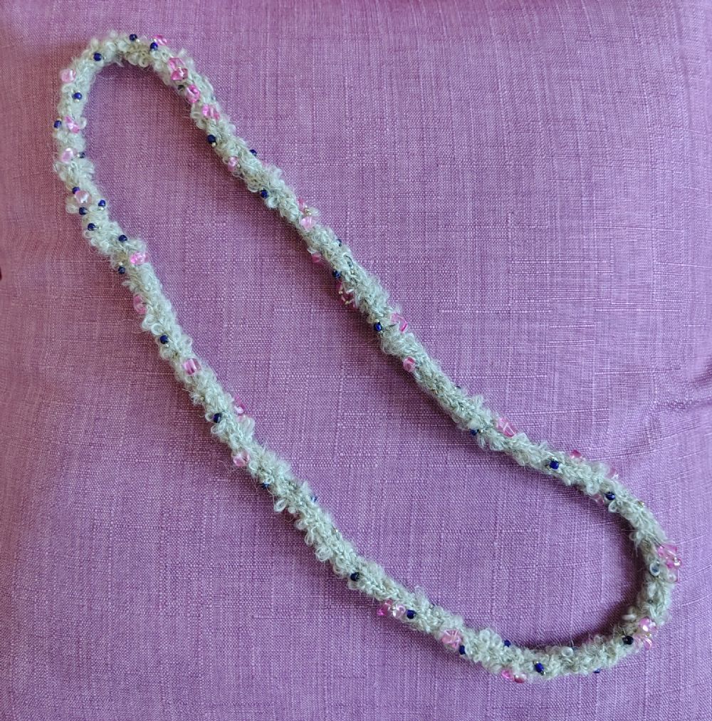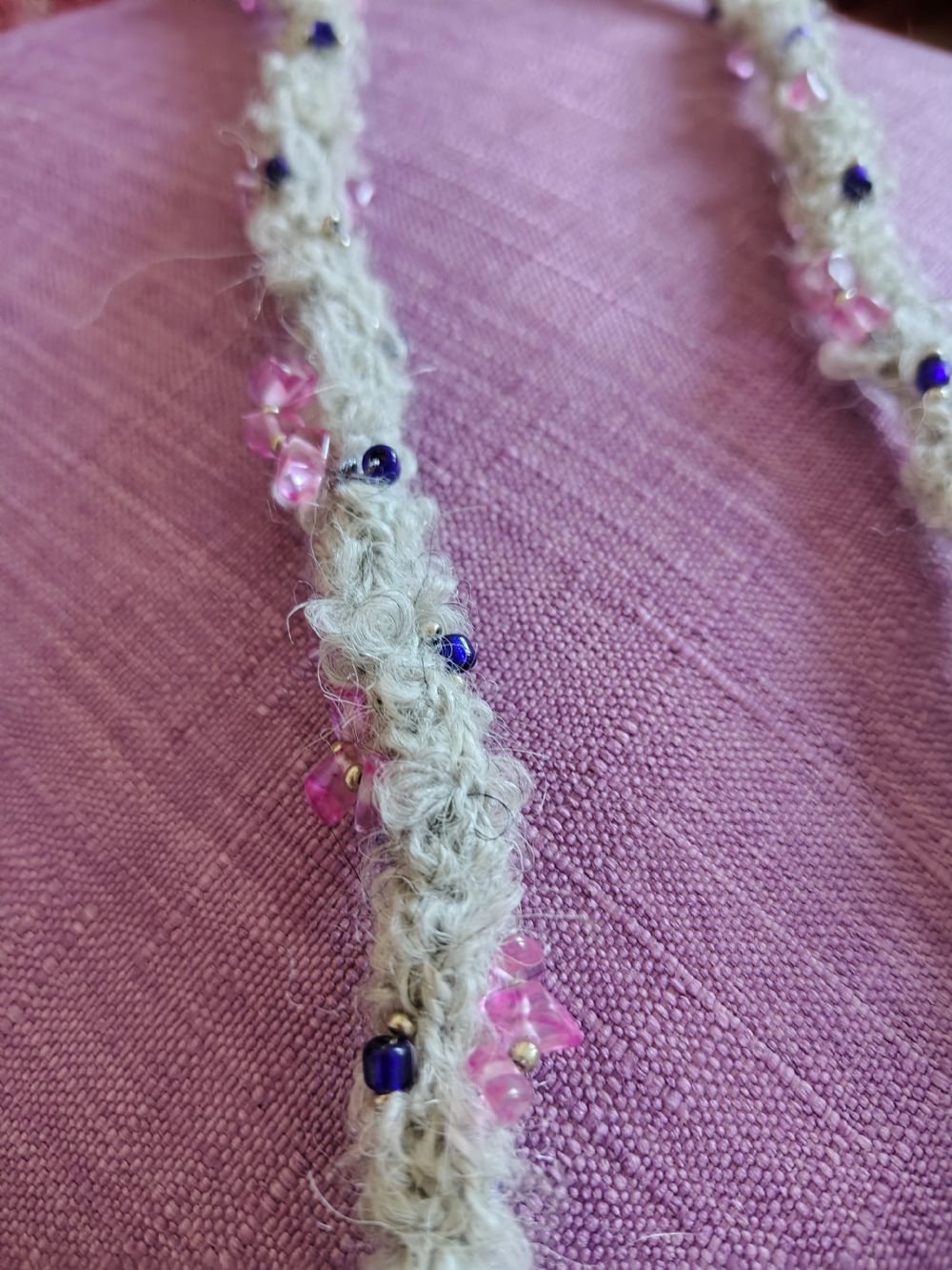 Descrizione:Collana auto prodotta in lana grigio chiaro abbellita con con perline sui toni del rosa-viola. Lunghezza 46 cm