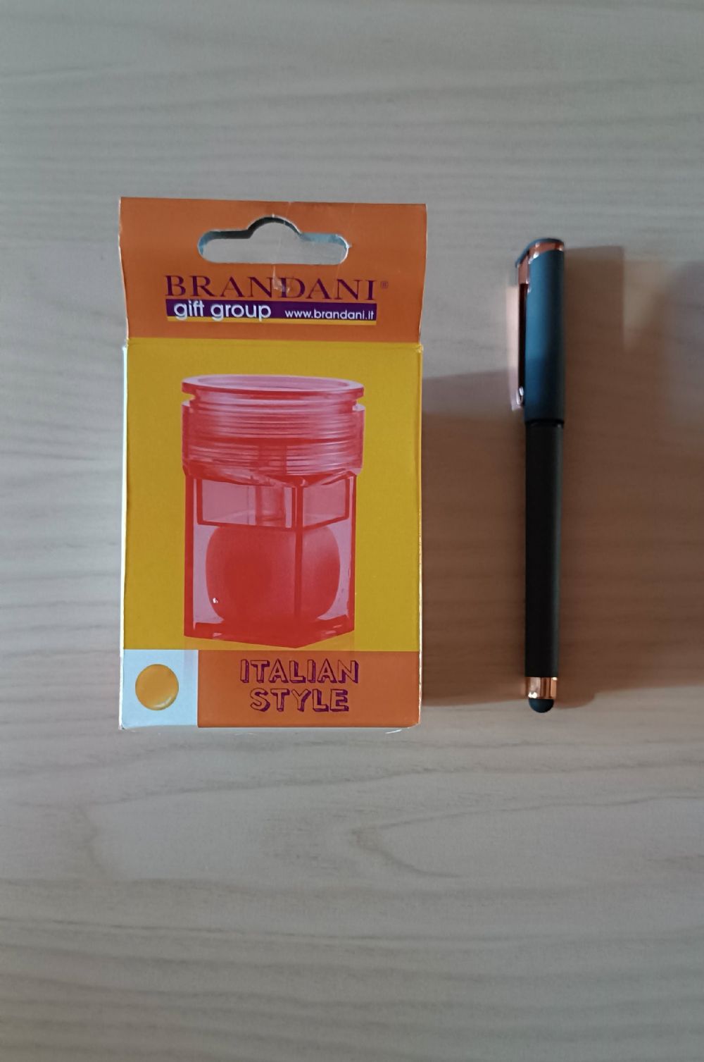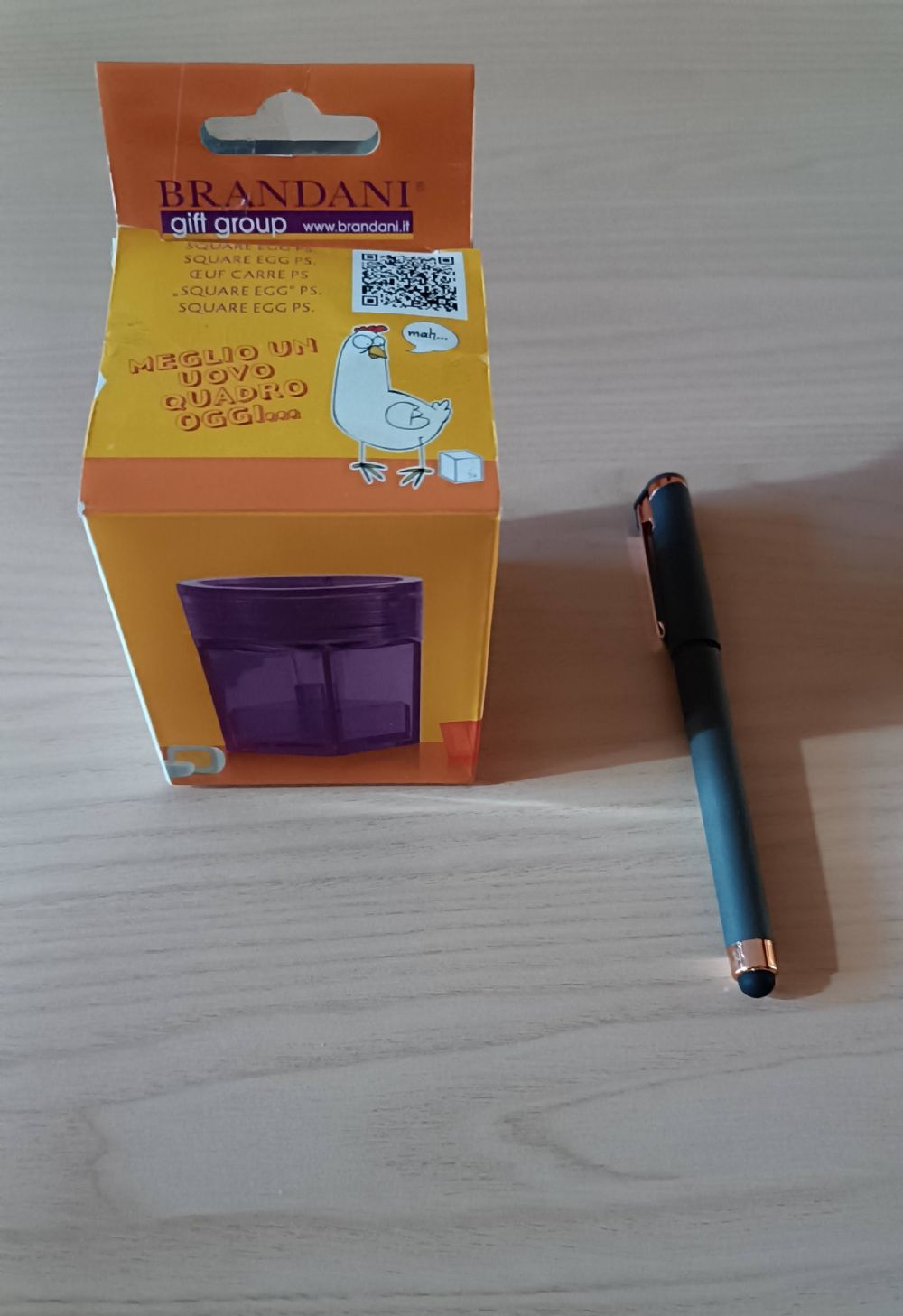 Colore rosso (trasparente), grande quanto la scatola, penna per proporzioni. In plastica.