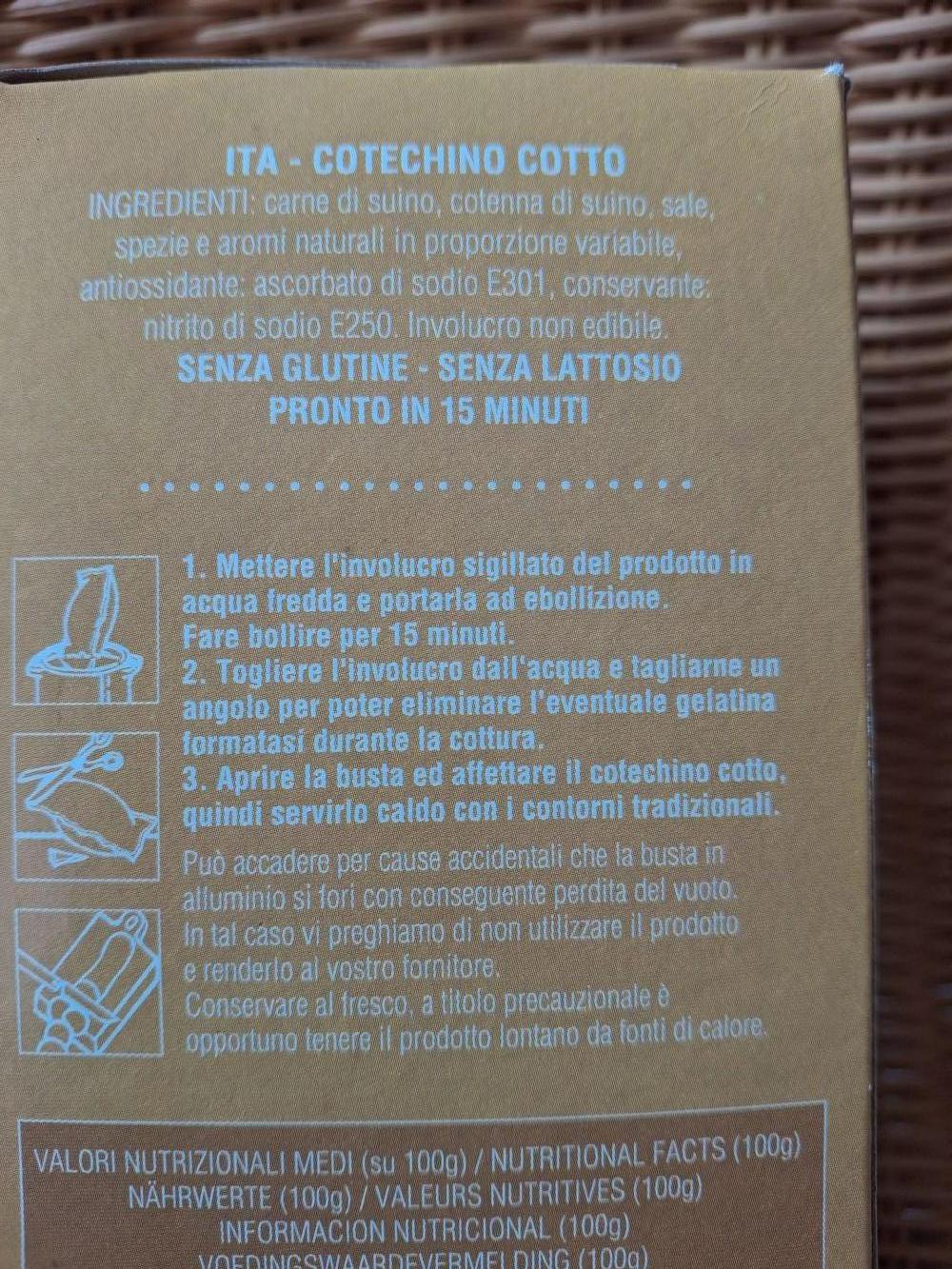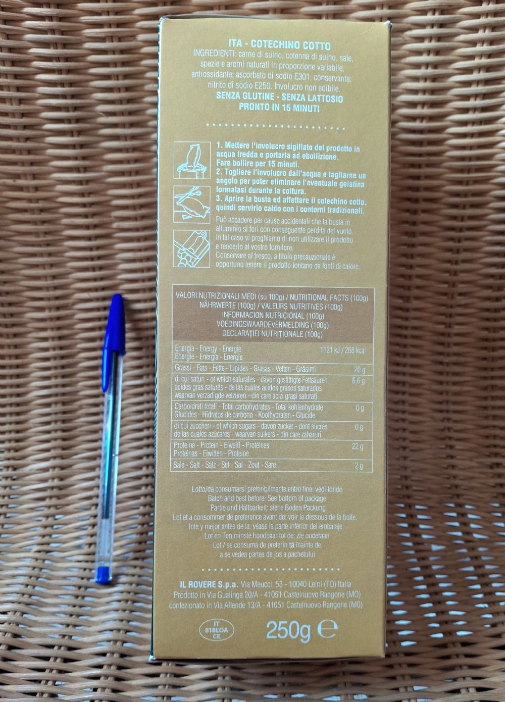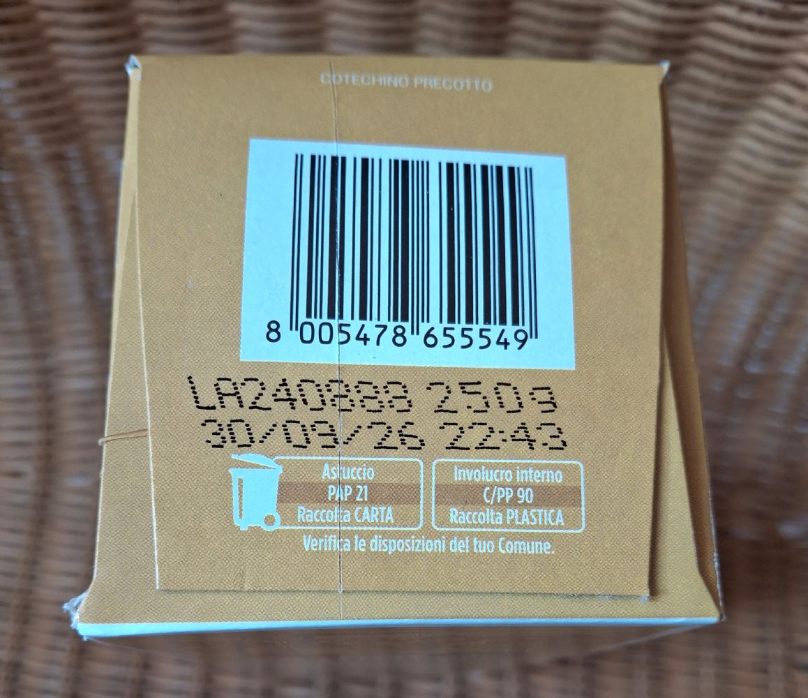 Confezione nuova e sigillata di cotechino cotto da consumarsi preferibilmente entro il 30/09/2026.