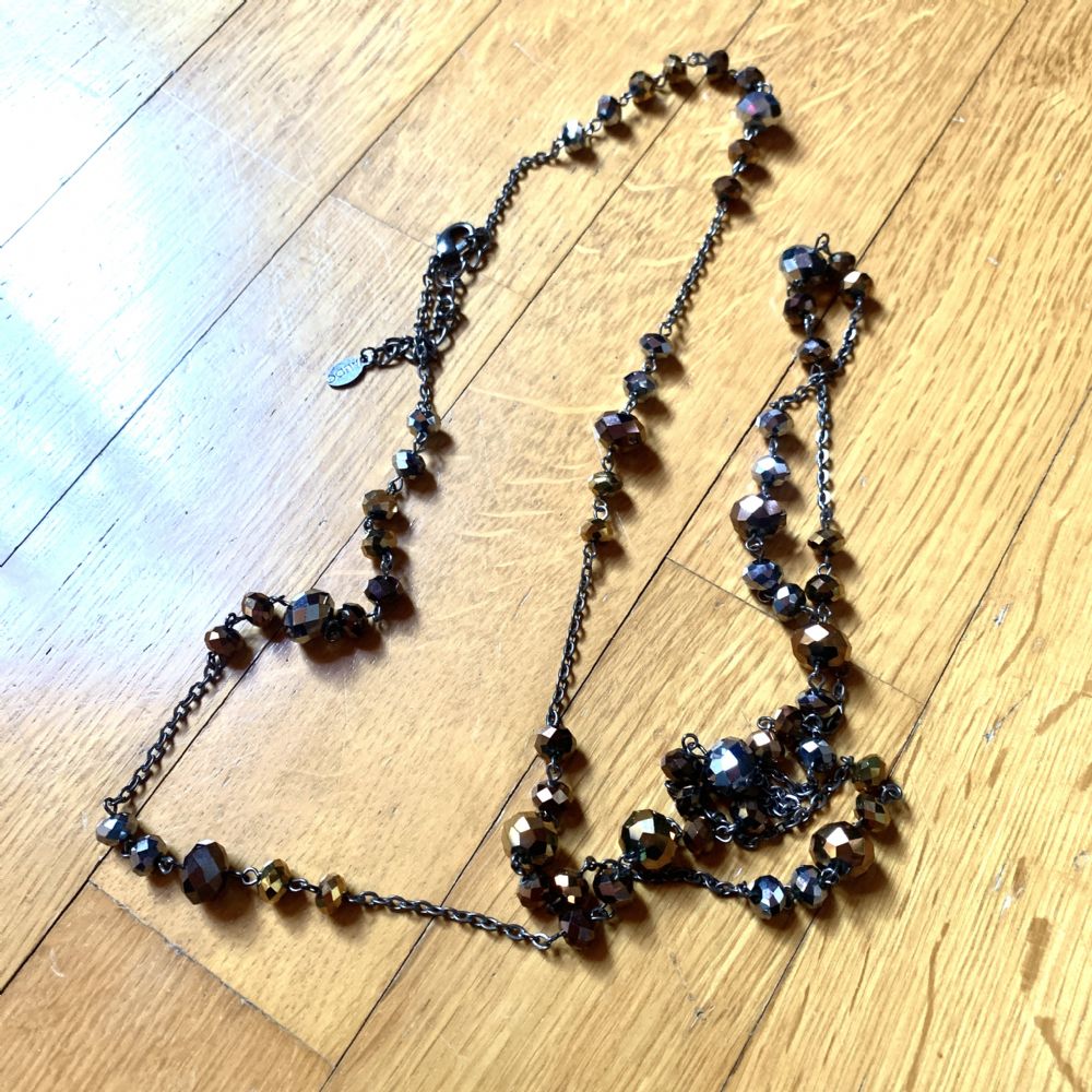 3- catena e perle sfaccettate cangianti color bronzo e argento, chiusura con moschettone e targhetta con logo Aldo, lunghezza cm 61x2