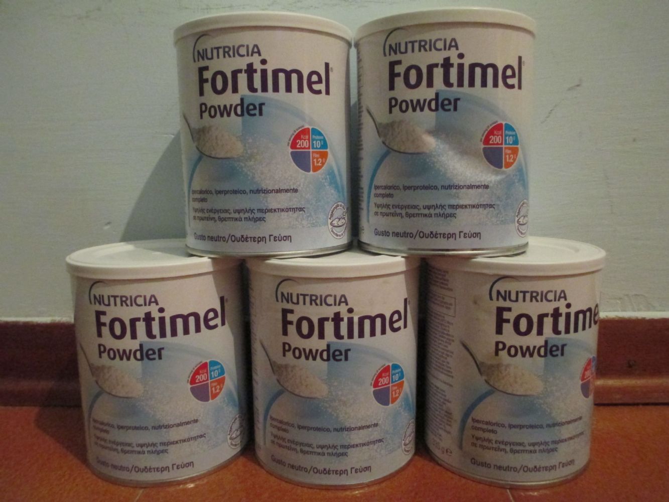 Cinque confezioni di alimenti ipercalorici, iperproteici, nutrizionalmente completi, da 335 g l'uno.