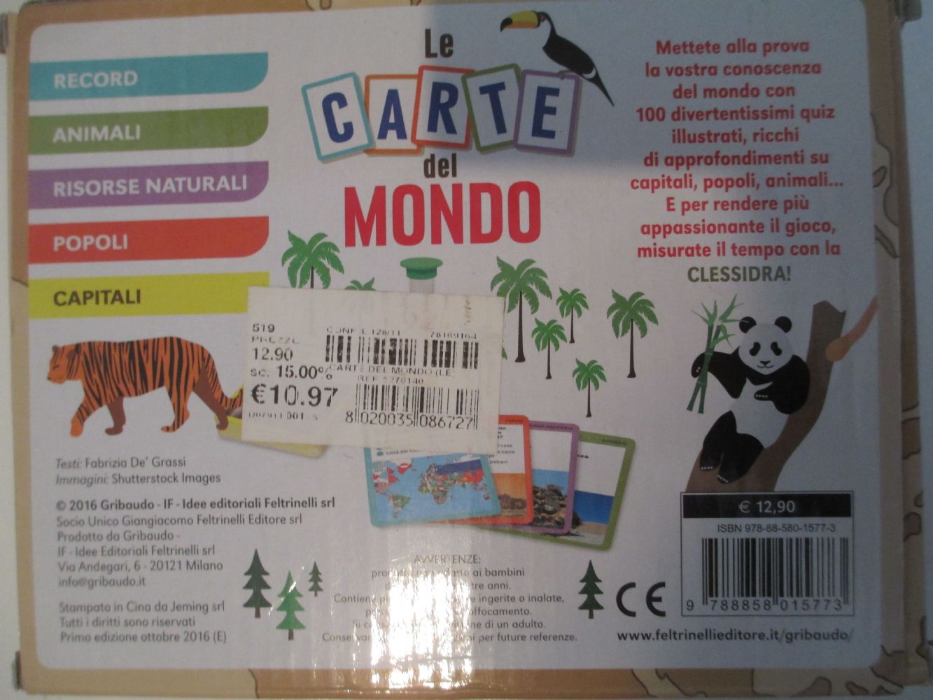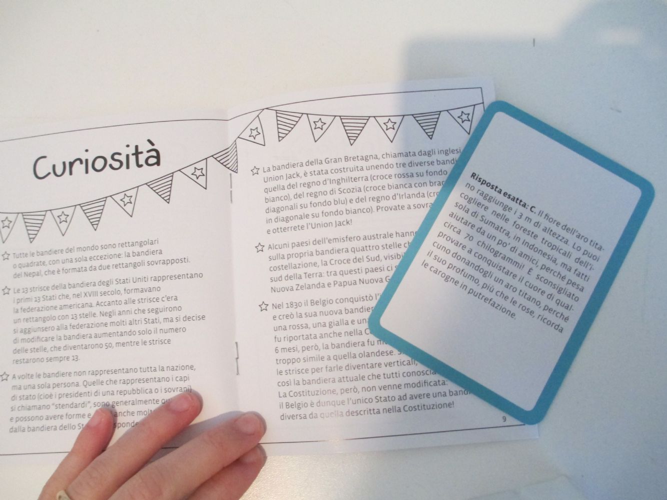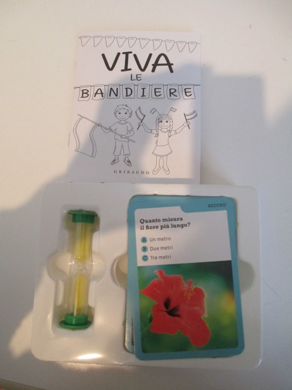 Ci sono 100 carte, una clessidra e un libretto sulle bandiere.