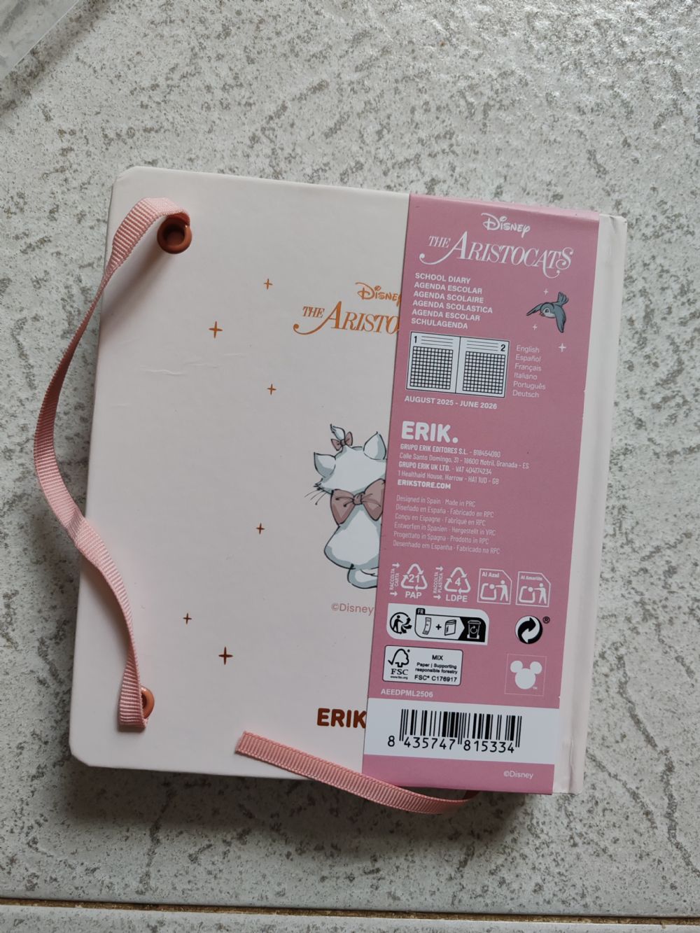 Descrizione:Diario minou aristogatti 2025-2026. Difetto sulla copertina visibile in foto