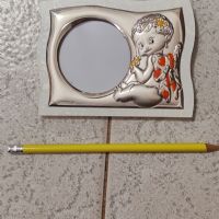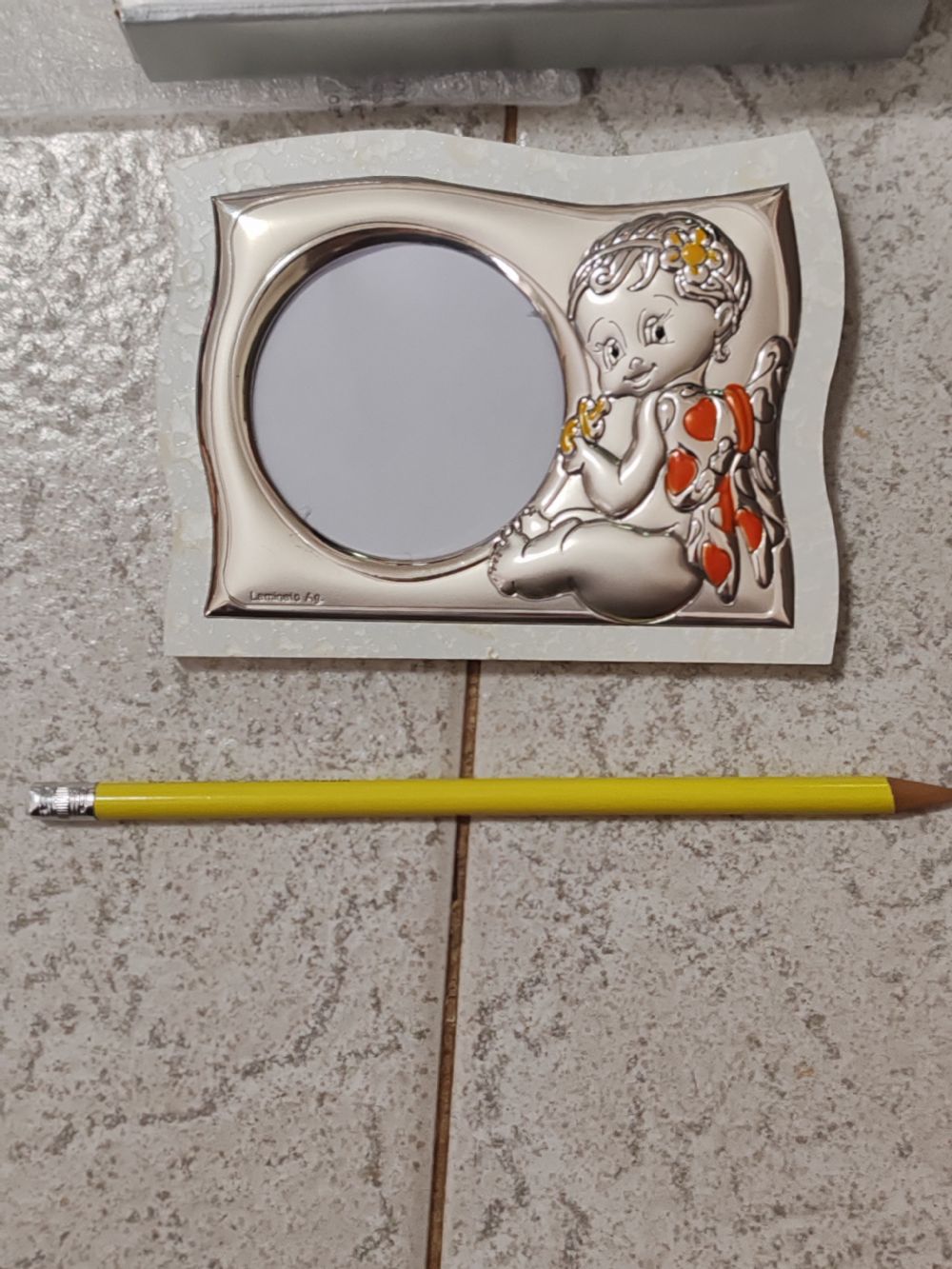 Descrizione:Cornice portafoto argento di piccole dimensioni da appoggio. Regalabile. Legno e metallo con simbolo argento