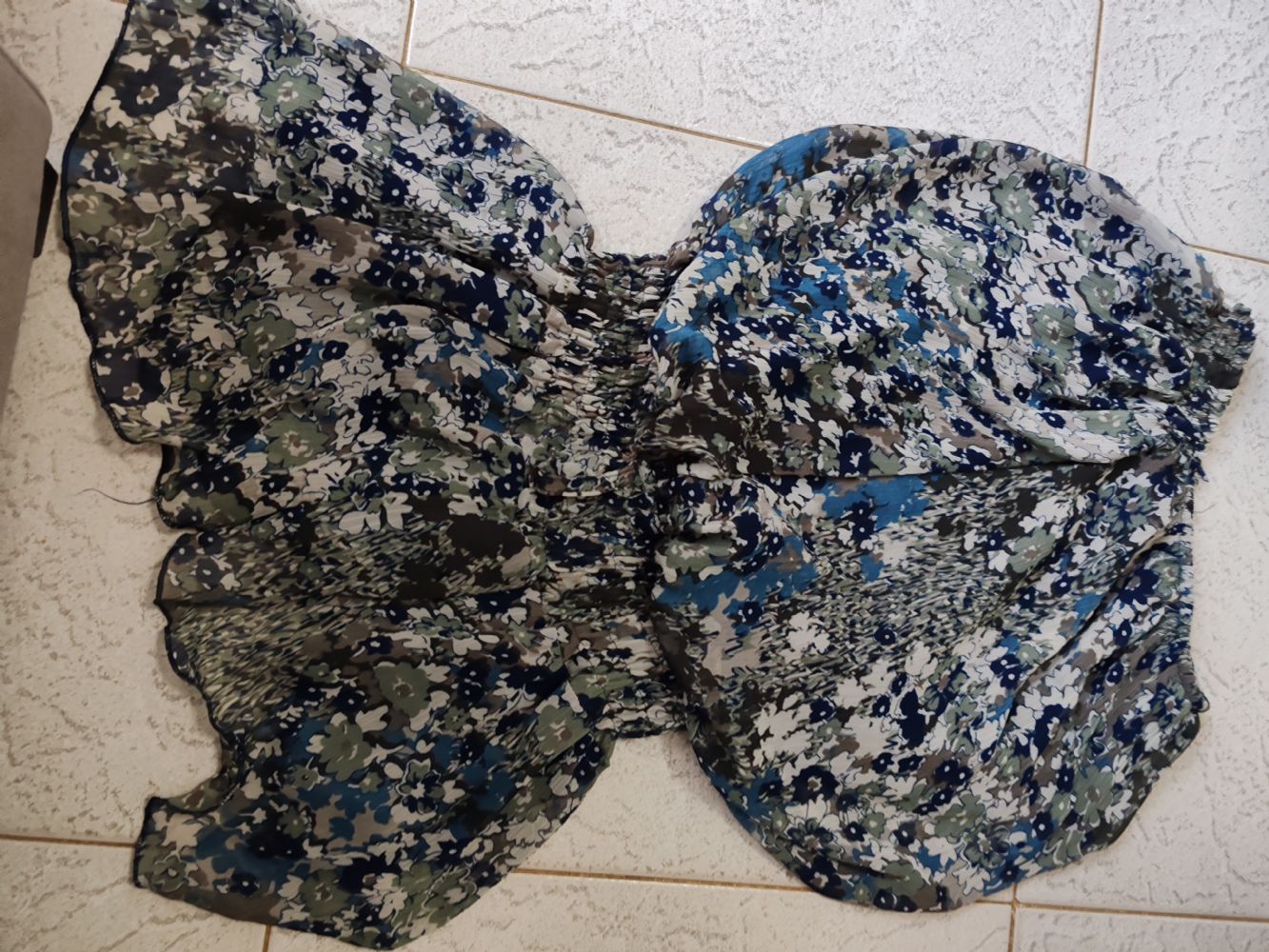 Descrizione:Senza bretelle con elastico in vita e volant fantasia tendente Al blu e verde militare. Taglia 42 Sintetico