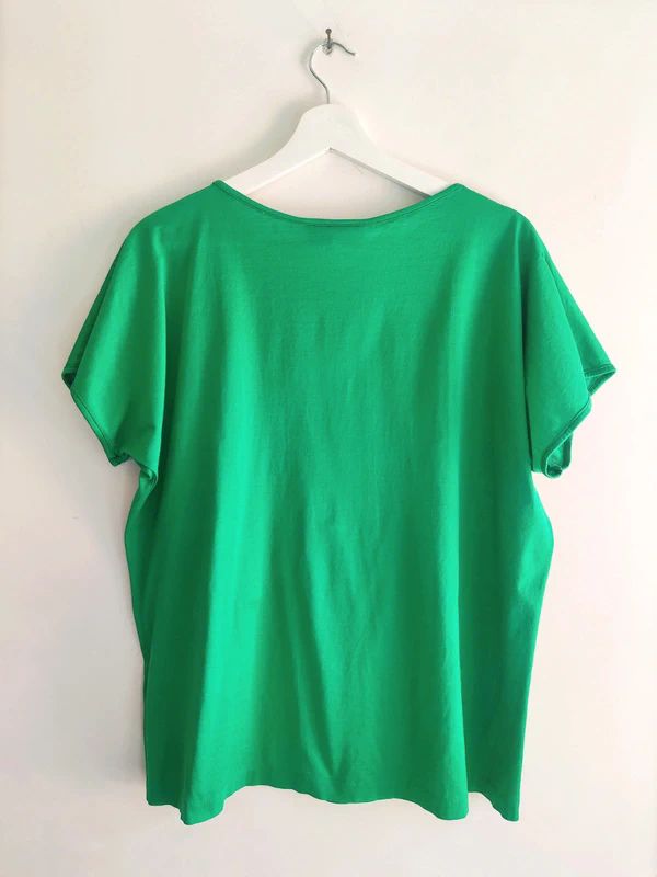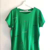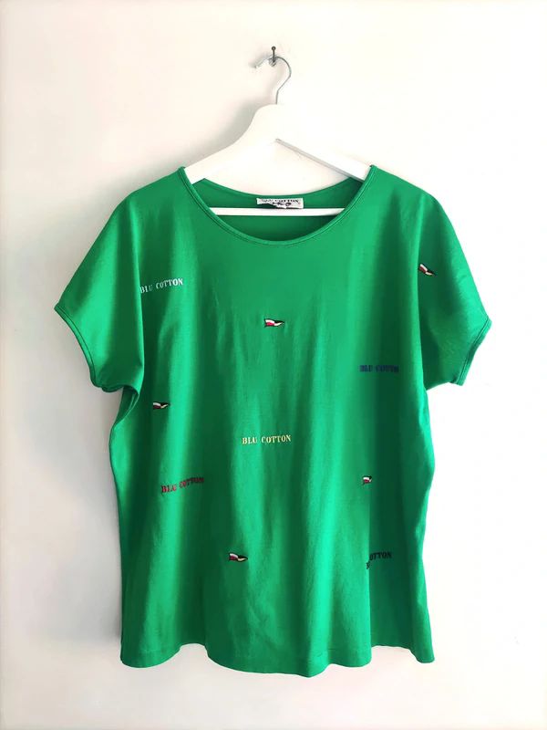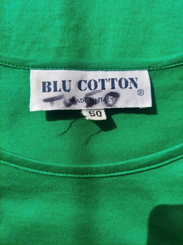 Descrizione:T-shirt da donna Blu Cotton verde saturo e acceso, con ricamati logo e bandiere. 100% cotone made in Italy, scollo tondo e taglio quasi a pipistrello, riporta taglia 50 ma veste secondo me una L, fate riferimento alle misure; l'ho provata io che vesto una M, ed è carina anche oversize. Nessun difetto, mai usata solo lavata.