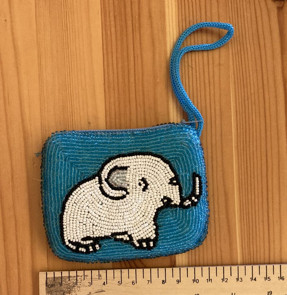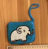 Descrizione:Portamonete con disegno elefante, fatto di perline, chiuso con zip.