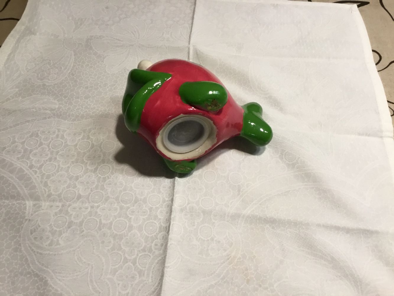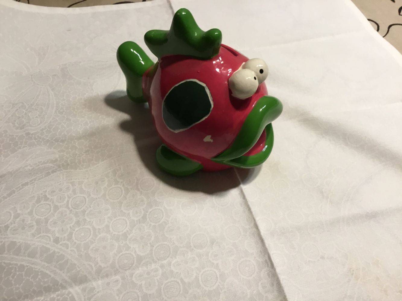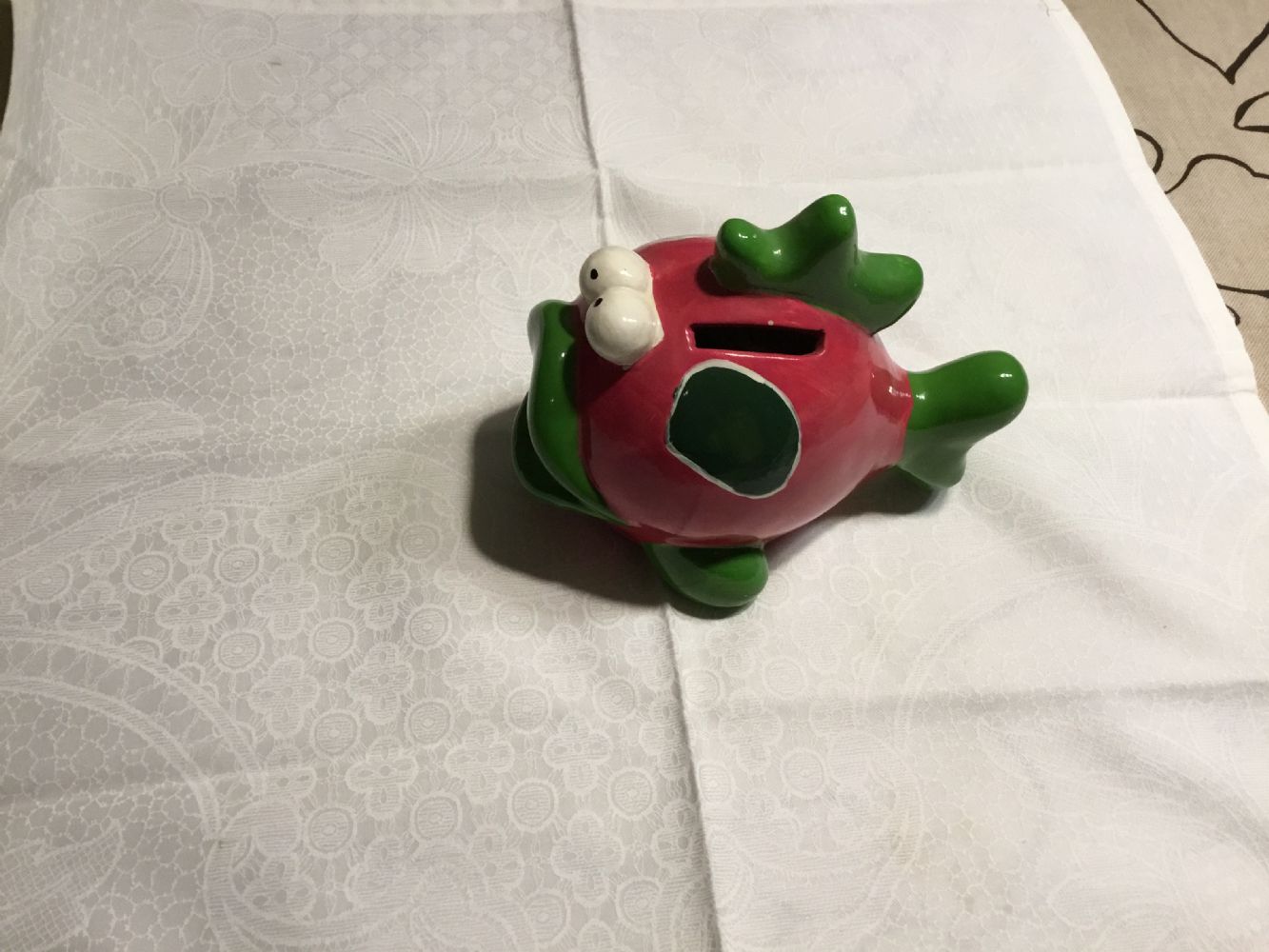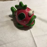 Descrizione:Simpatico salvadanaio in ceramica a forma di pesce, colori prevalenti fucsia e verde. In alto ha fessura per le monete, in basso il tappo per svuotarlo senza romperlo.