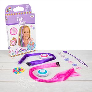 2 cofanetti di gessetti colorati per capelli, 2 extension colorate, 30 perline a cuore, 4 fiori di stoffa con perla, applicatore di perline, 20 elastici, guida